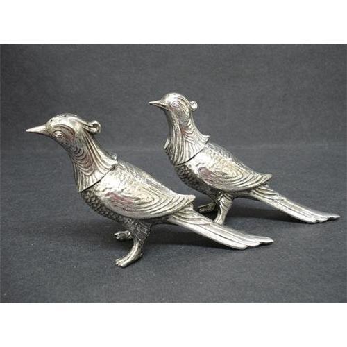 BEAUTIFUL FIGURAL SALT AND PEPPER SHAKERS, HIGHLY DETAILED, THESE ARE SILVER PLATED AND SIGNED AS FOLLOWS: SP - 1035 - and what it looks like TRIPLE,hard to read, excellent used condition, no dents or cracks, Measuring about 3 1/4" high, 5 1/2" long, US Buyer to pay 8.00 for shipping plus insurance.THANKS.