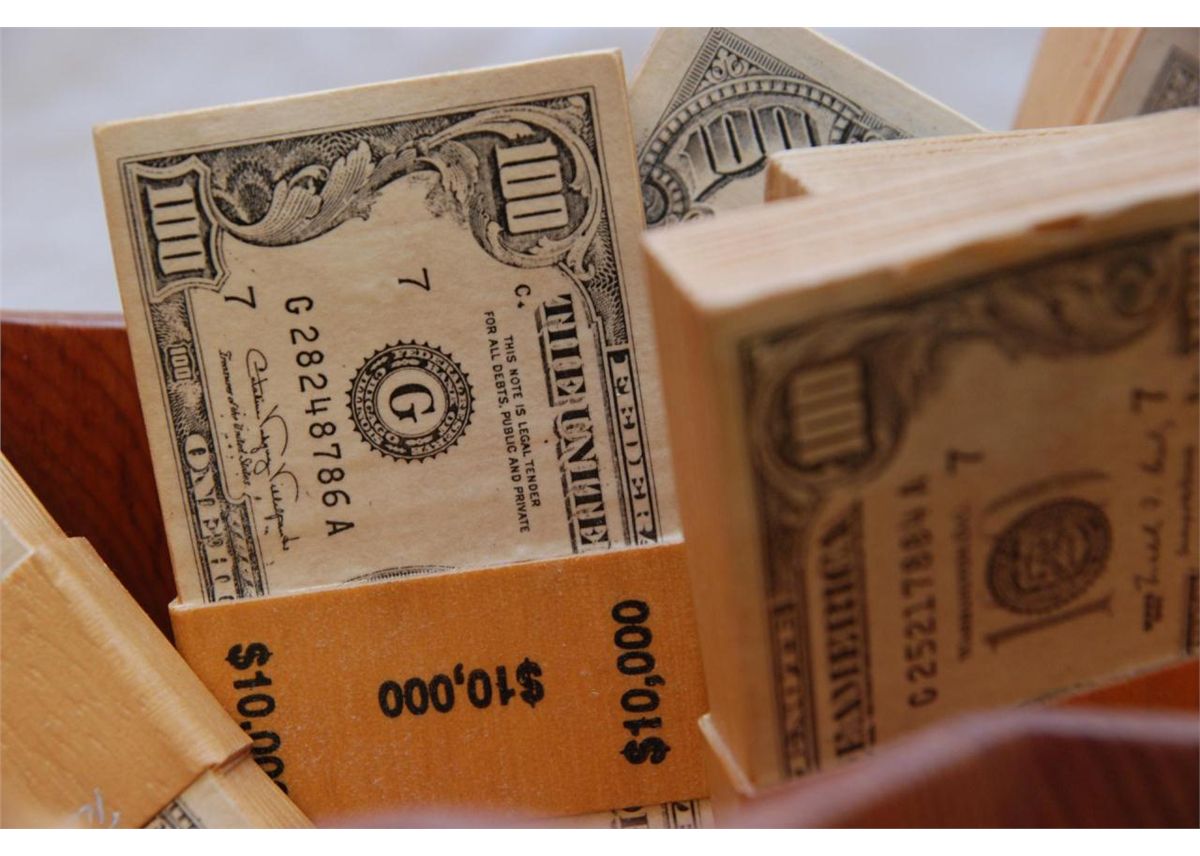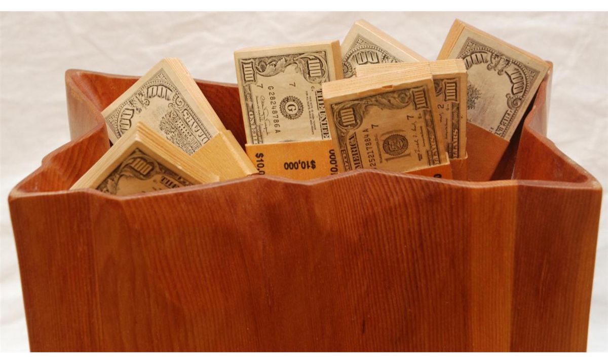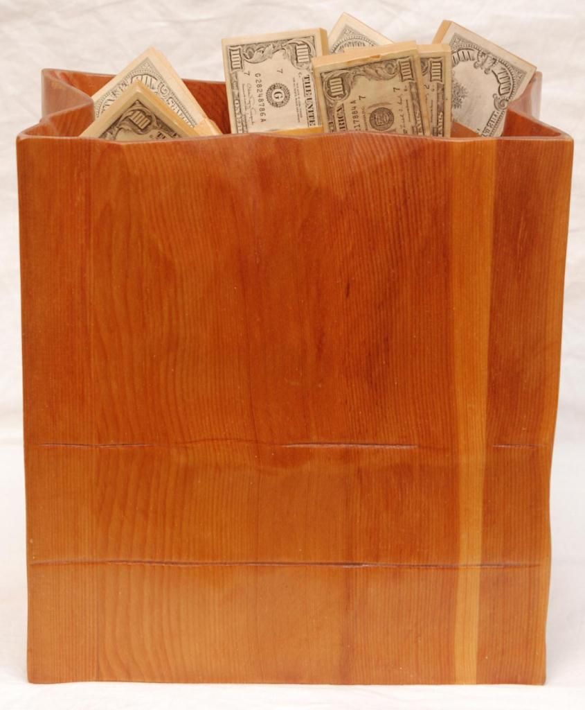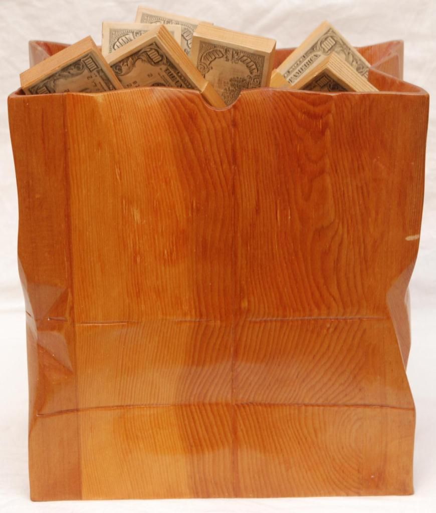 Wooden figural sculpture depicting a bag of money. Artist signed and titled 'Mirage'. Bag measures 14 1/4" height x 13 1/8" width x 7" depth (36.1cm x 33.3cm x 17.8cm). Money bundles measure approx. 6 1/8" x 2 5/8 width x 1 1/8" depth (15.5cm x 6.6cm x 2.8cm). Total weight of 6.22 kilograms.