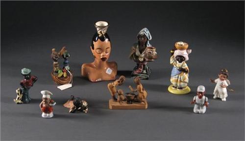 Lot figurines to include three bisque, one craft ceramic head vase, one porcelain match holder, two composition items, one plastic wind-up baseball player (non-operational), two wood carved groupings, nearly all depicting children or women of African desc