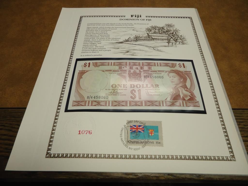 FIJI $1 CRISP UNC CURRENCY AND STAMP SET AS SHOWN