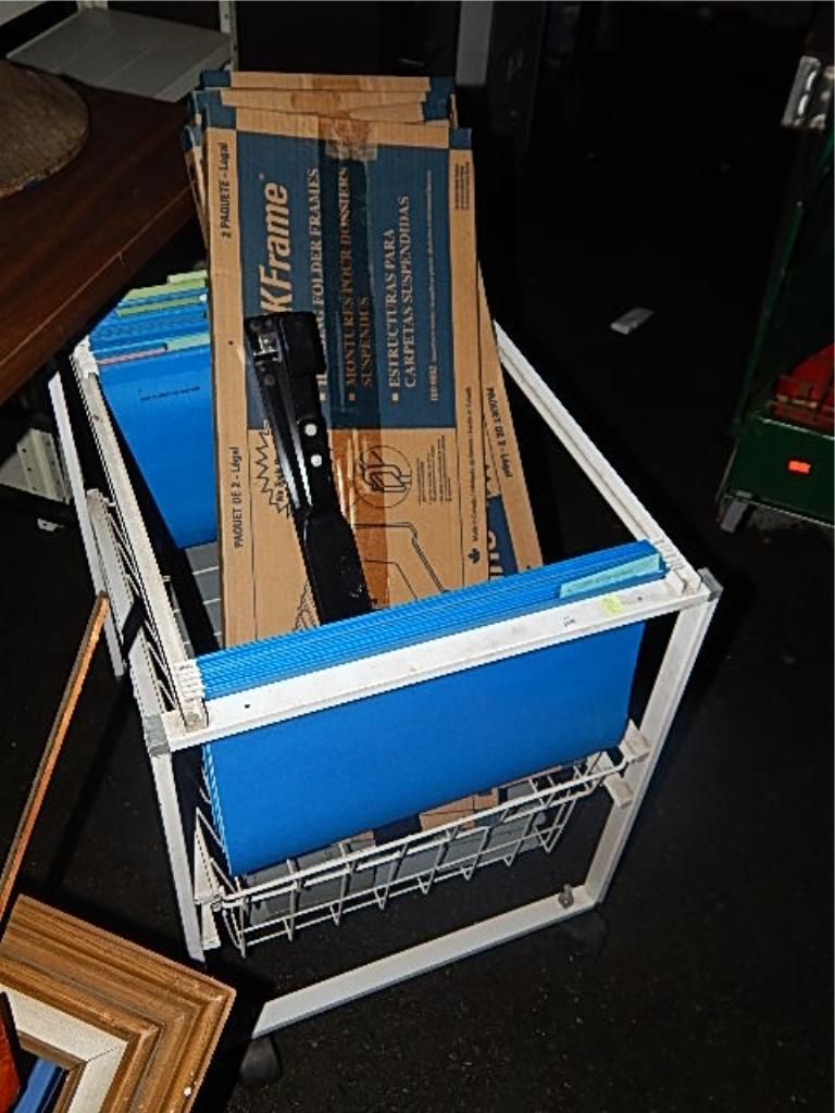 FILE HOLDER ON WHEELS - LEGAL - PLUS NEW FILE WIRE HANGERS (LEGAL SIZE) AND ESTRA LONG STAPLER