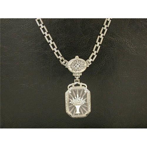 <table width="100%" border="0" cellspacing="0" cellpadding="4"><tr><td><em> FABULOUS OLD LOOK!</em></td></tr><tr> <td width="100%"> This Antique Style Necklace is an Authentic & Accurate copy of a Necklace from the 1920's - and THIS one is in Mint condition. This Antique Style Sterling Silver Necklace is 19 inches in length and features a magnificent Camphor Glass pendant with a Green Enamelled basket of flowers accented by 2 small Diamonds. There is an Oval Camphor Glass above it set with a Diamond.This Necklace IS stunning! </td></tr><tr> <td> </td></tr><tr> <td>Reference #: 57895</td></tr><tr><td>Condition:Mint</td></tr><tr><td>Year:1980</td></tr><tr><td>Title:FILIGREE Necklace Camphor Glass w DIAMONDS </td></tr><tr><td>Location:Virginia</td></tr></table>