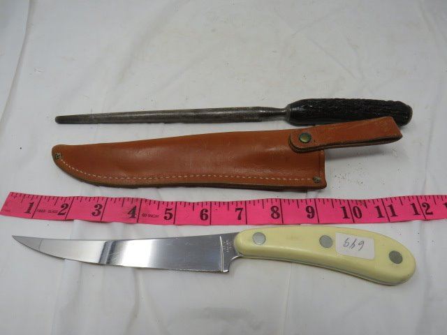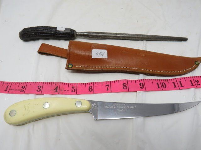 FILLETING KNIFE W/LEATHER SHEAF & KNIFE SHARPENER