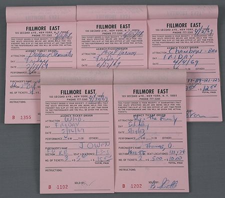 A rare set of five ticket sales receipt books from the "glory days" of the rock concert hall, the Fillmore East in New York City. These receipt books contain carbon copies of ticket sales made at record stores, etc. The original receipt would be handed to the client who would present it at the box office "Will Call" window on the day of the show, and these ticket books were retained as proof of sale. Thus, the records within these books are relics of some of the historic rock shows held at the Fillmore. The great majority of these 1969 receipt copies are light but legible. Among the 250 receipts are tickets sales for Jefferson Airplane, Creedence, Procol Harum, Sly and the Family Stone, John Mayall, The Band, Iron Butterfly, Led Zeppelin, The Who, Blood, Sweat & Tears, Ten Years After, and others. Overall very good. Should be viewed.