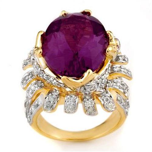 This extraordinary diamond and gemstone ring features a dazzling oval purple amethyst surrounded by vibrant diamonds. Rendered in lustrous yellow gold, this open floral ring is enhanced with shimmering diamond accents.<BR><BR>This February birthstone, a favorite of Egyptian and British royalty, is believed to have the power to dissipate evil and quicken one's intelligence.