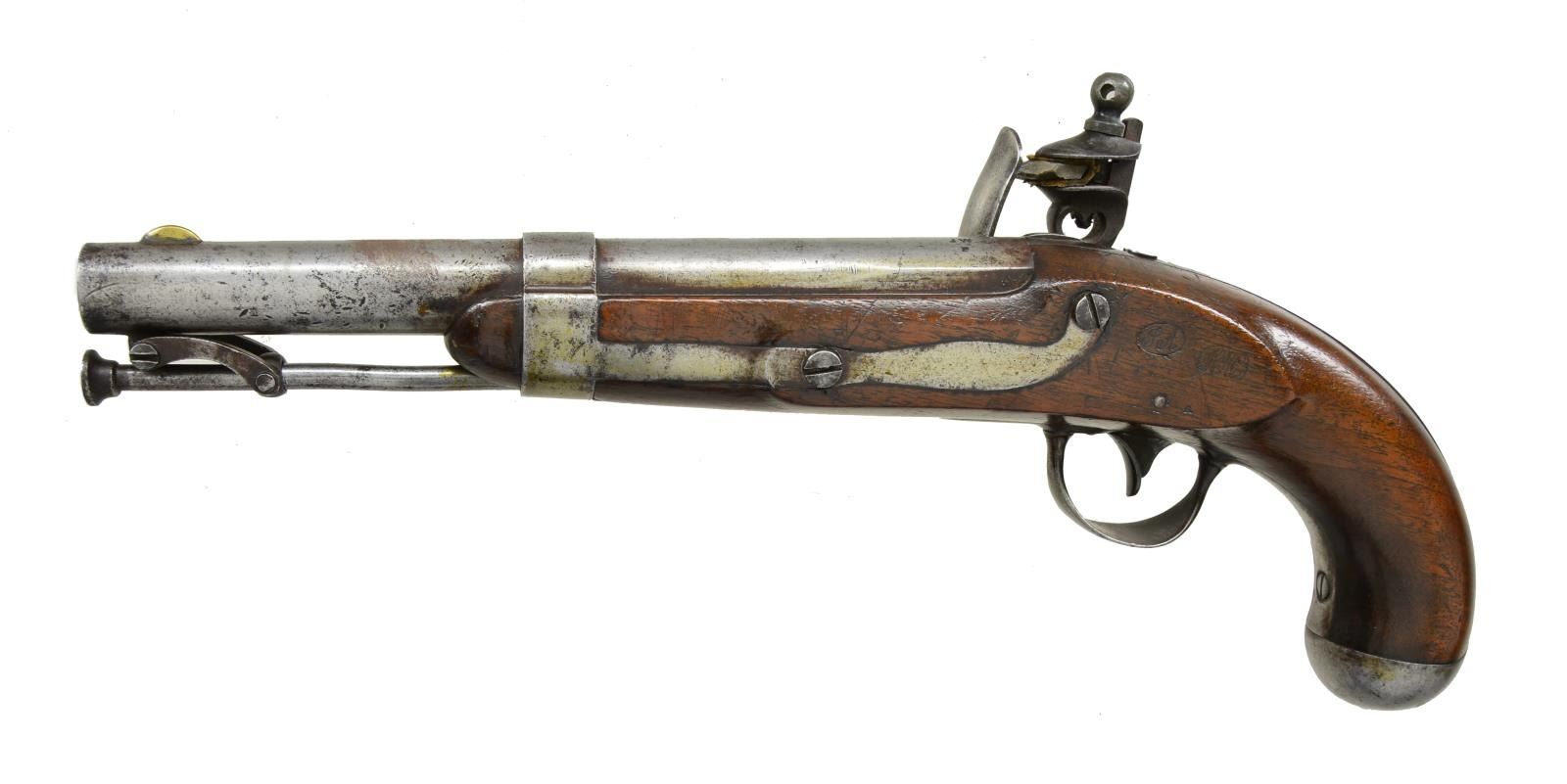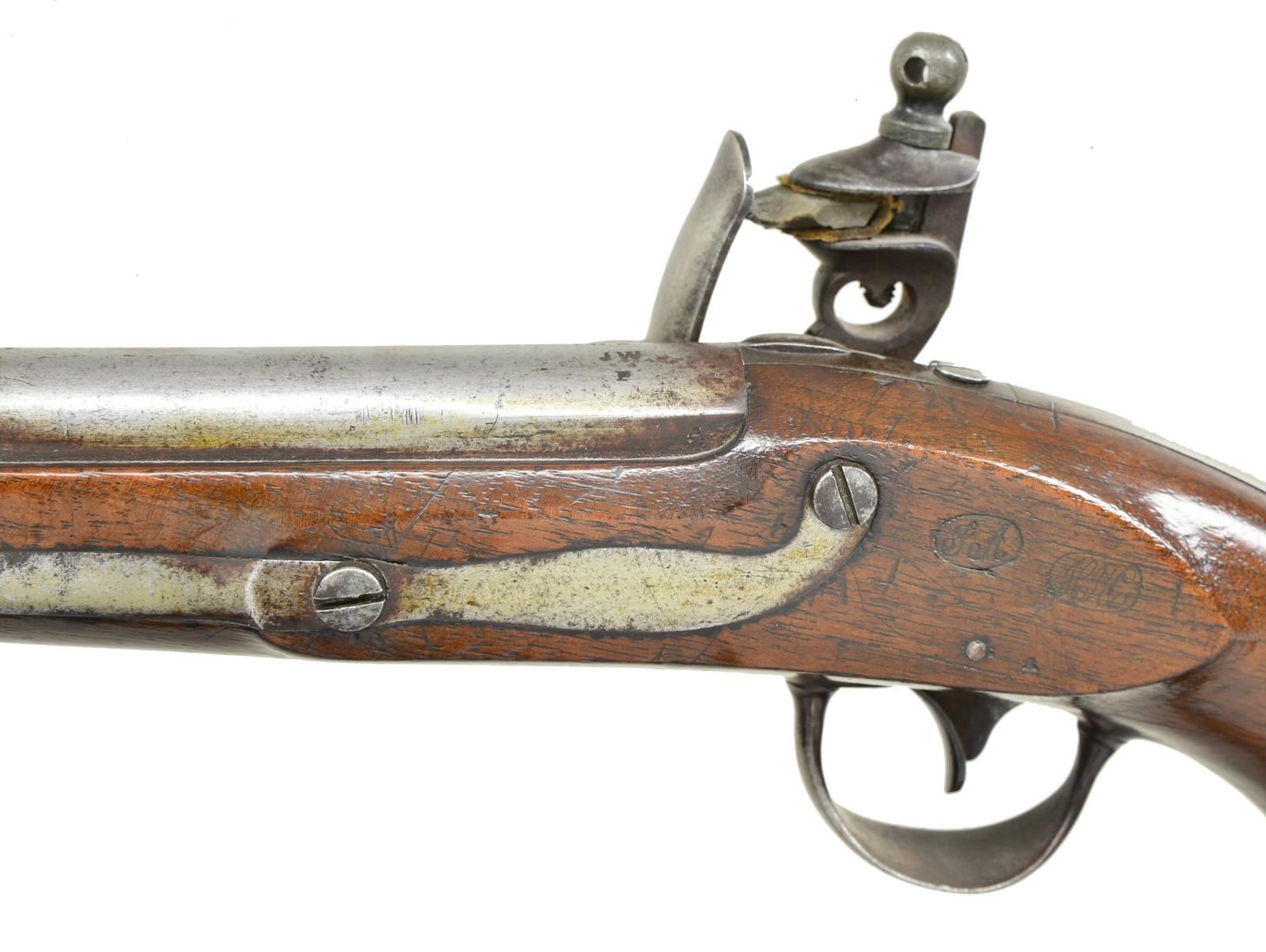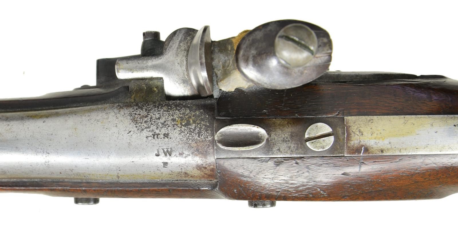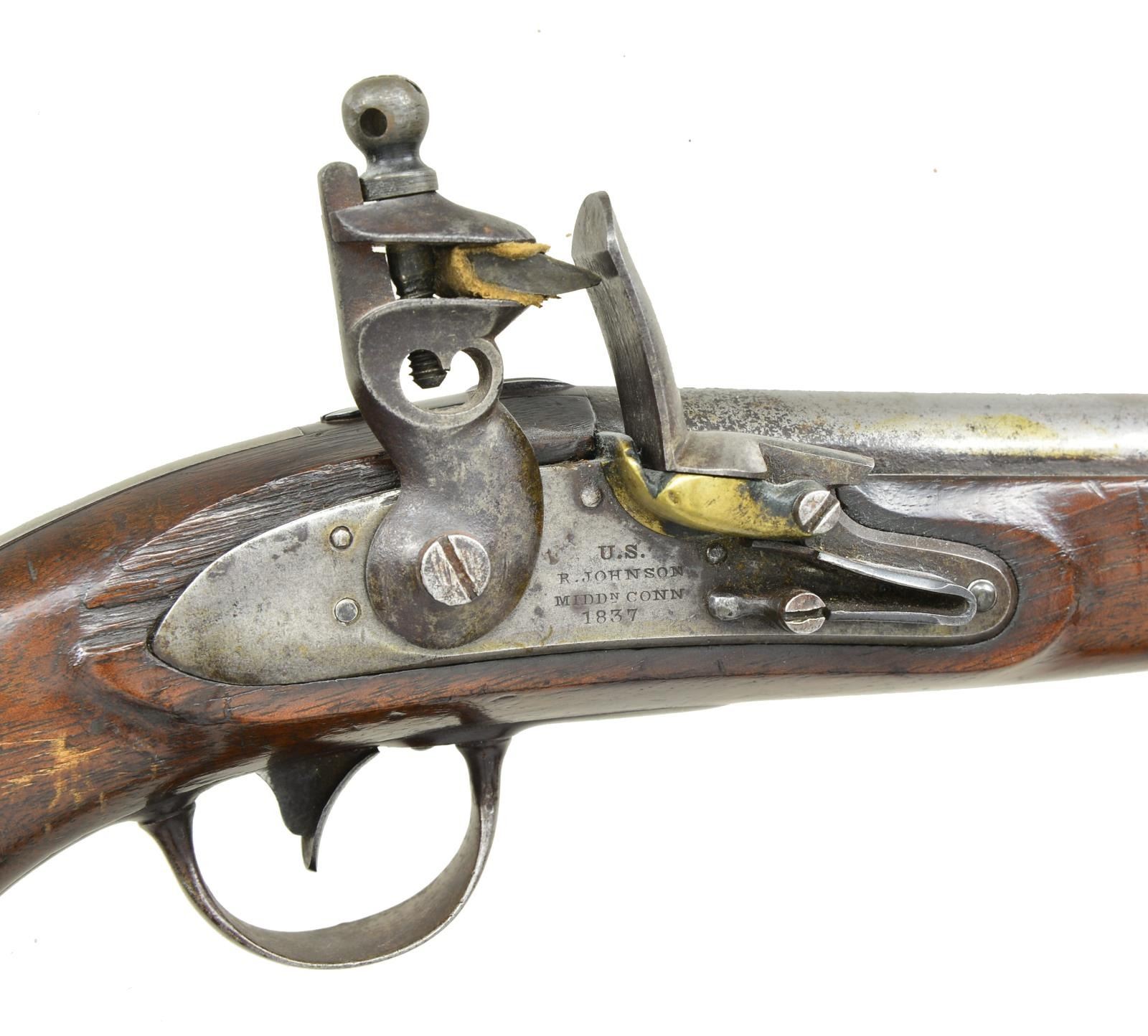 FLINTLOCK PISTOL. Cal. 54. NSN. 8.5” barrel inspected at breech “US / JW / P”, lock: “US / R. JOHNSON / MIDD’N CONN / 1837”. Robert Johnson delivered 18,000 pistols (1836-1844) and earliest dates like this are scarce as only 3000 of 18,000 guns made before 1840. This is a fine all original example with 2 sharp inspector cartouches. CONDITION: very good, metal gray overall, pitting, good markings, stock chipped above lock mortise but well patinaed showing it was done in time of use, mechanics fine, smooth clear bore. (01-21468/JS). ANTIQUE. $2,000-3,000.