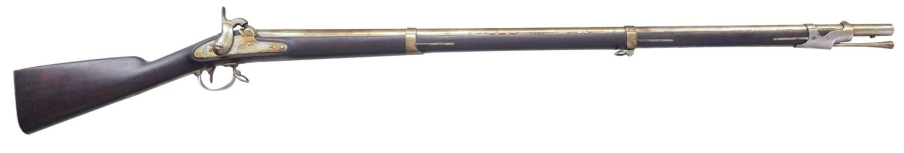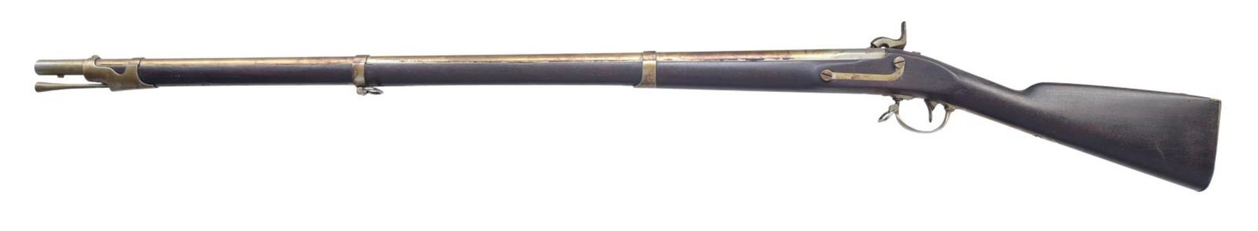Cal. 69, NSN. This is an attractive early Springfield musket that saw little use, good bright metal & raised grain stock. Standard configuration, 42" barrel, "VP / eagle head" proofs at breech, 1849 dated tang. Lock marked vertically at tail "SPRING / FIELD / 1849" & stamped in center with eagle over "US". CONDITION: very good to fine overall, complete & original. Metal is mostly bright, stained varnish coating, markings in metal all crisp, single inspection cartouche is light. Mechanics are fine, mostly bright & shiny smooth bore. (01-25102/JS). ANTIQUE. $1,200-1,500.