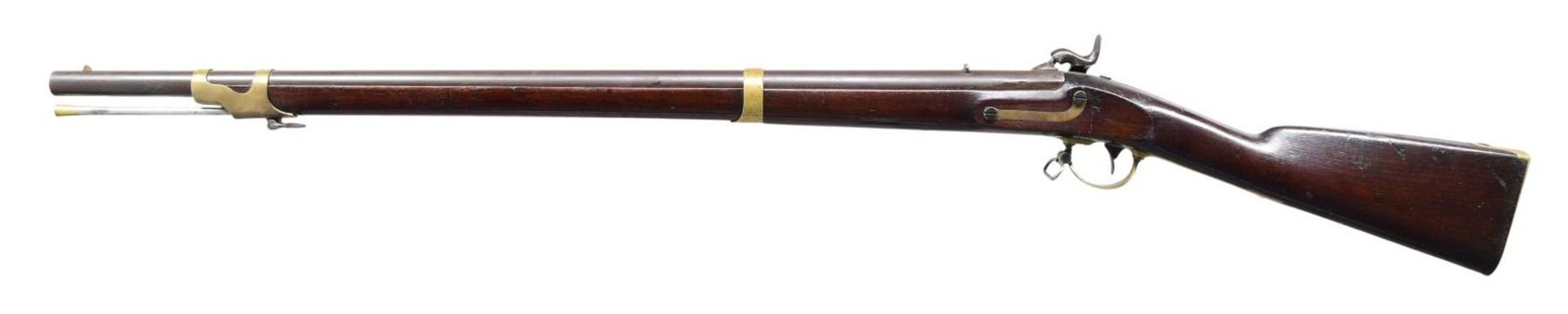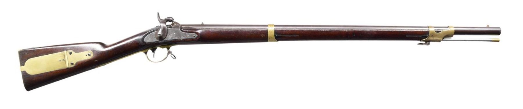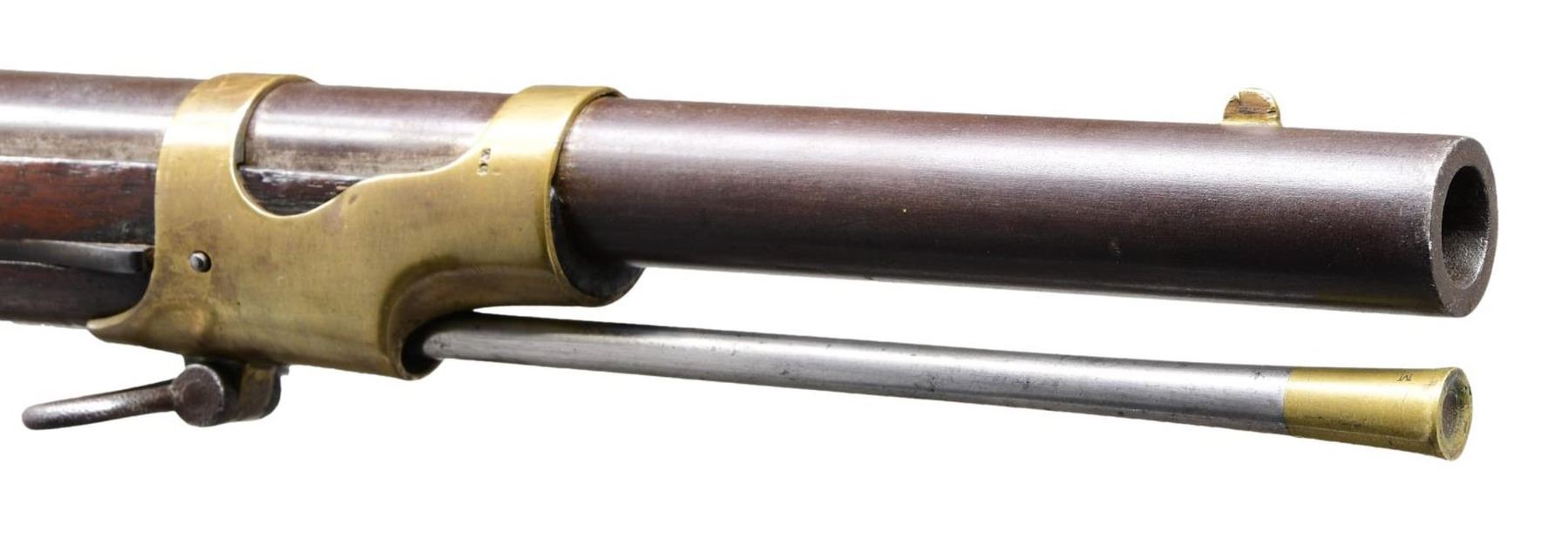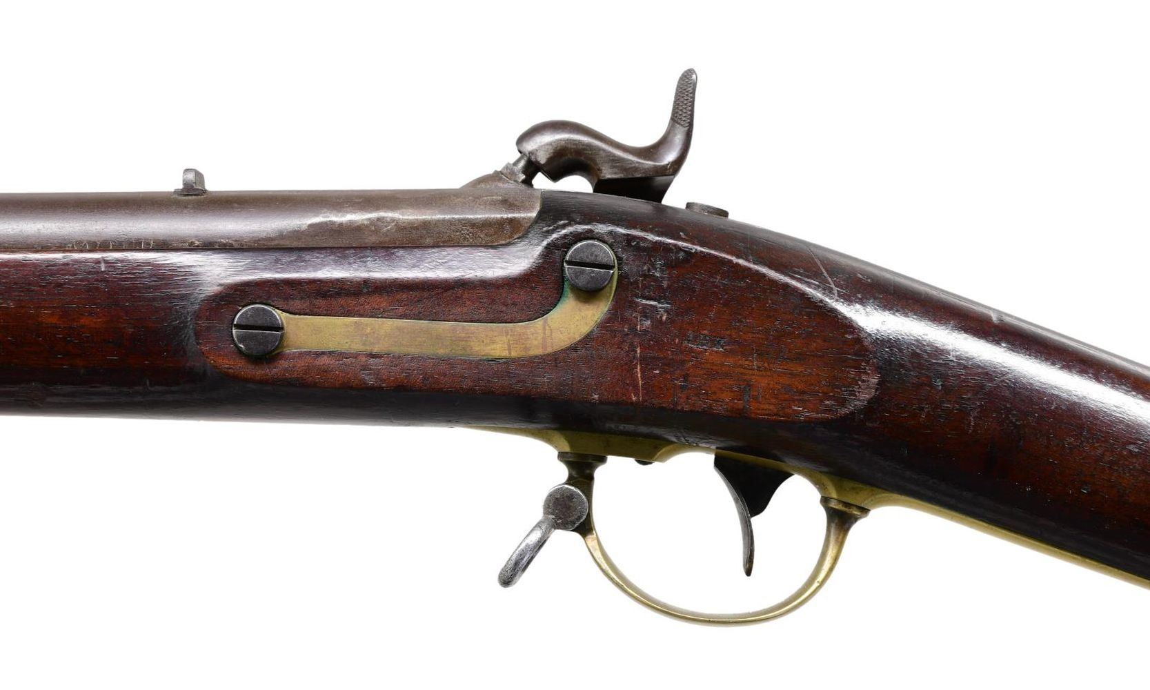 Cal. 54. NSN. Standard configuration of last year production of model 1841 Harpers Ferry rifle, 33" barrel, brass furniture, fixed rear sight, brass tipped ramrod, and brass blade front sight. Harpers Ferry inspection "JHK" stamped in wood opposite stock, and "WW / P" on barrel. This is an attractive complete and original example of one of the last Mississippi rifles made just prior to adoption of the model 1855 rifles. CONDITION: very good overall. Barrel overall is smooth mottled brown/plum patina, marking's good; the last number in barrel date is missing. Lock is smooth and gray with crisp markings. Brass has mottled light mustard patina. Stock is sound, well fit with old varnish. Mechanically fine, good rifled bore. PROVENANCE: Collection of Dr. Frederick Novy (01-25312/JS). ANTIQUE. $2,500-3,000.