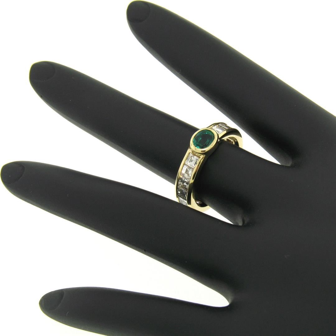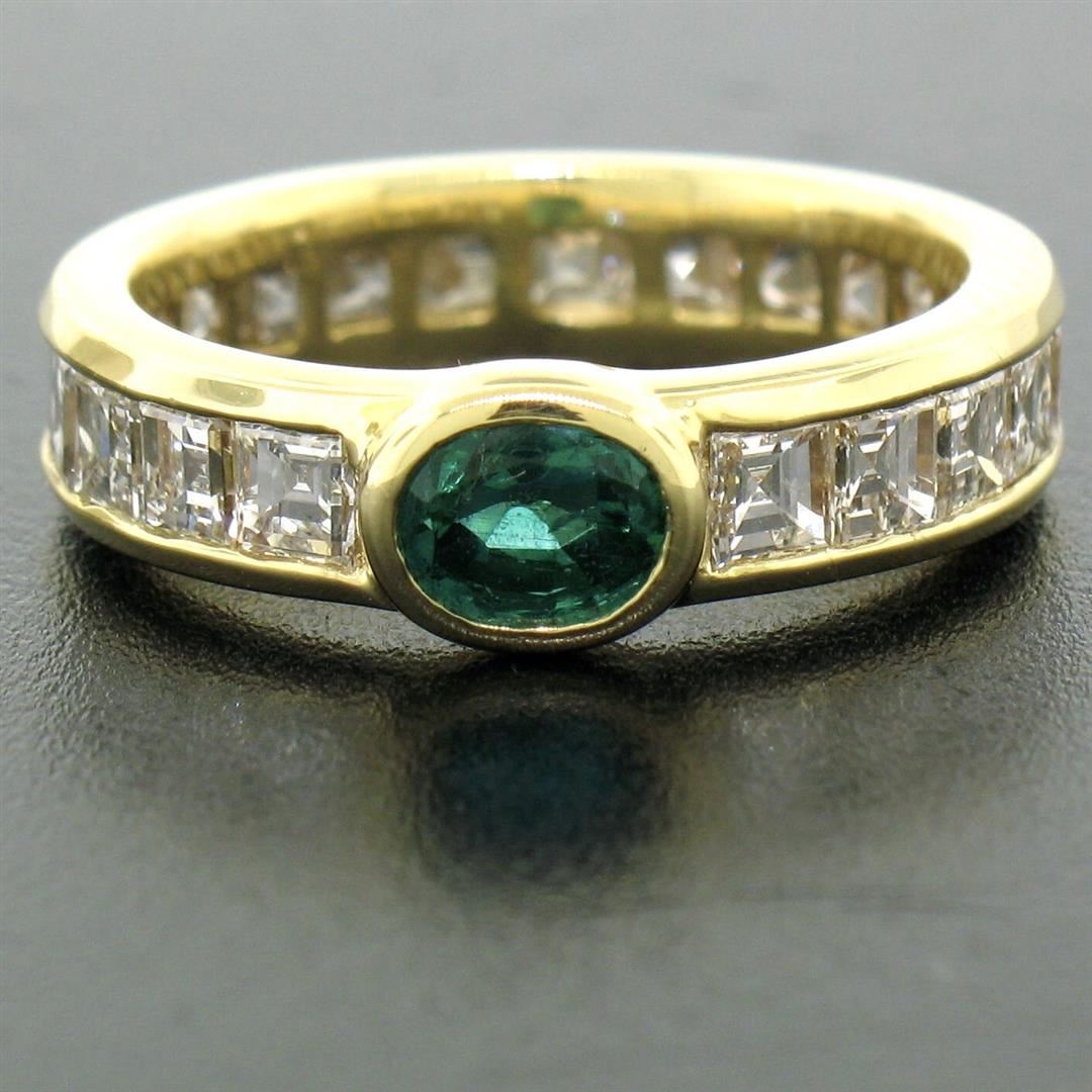 An estate solid 18k yellow gold sideway eternity solitaire ring, with 1 oval cut natural emerald (0.40ctw), and 21 square step cut natural diamonds (D/E - VVS1/VVS2; 4.00ctw). The ring is size 5.5, weighs a total of 4.61 grams, and measures 4.55mm wide.