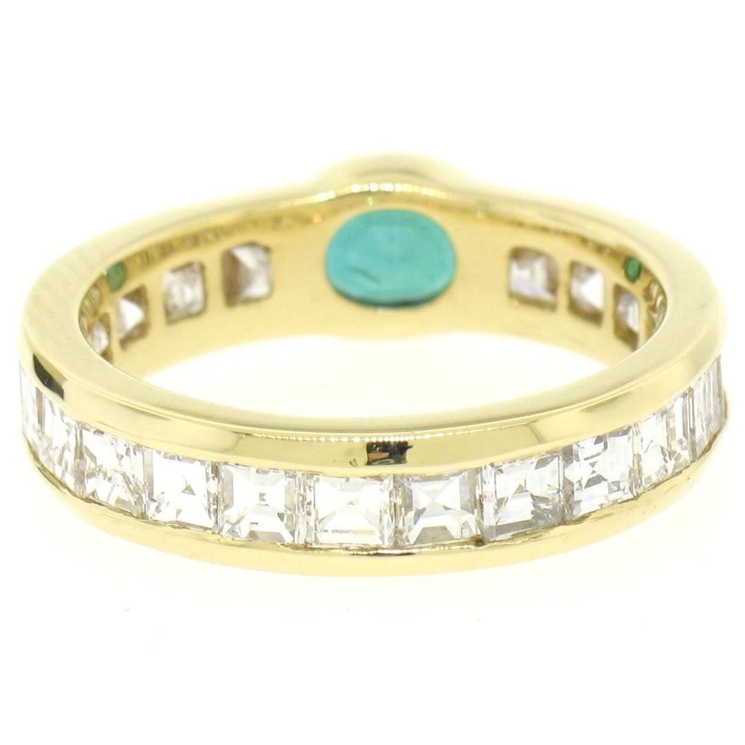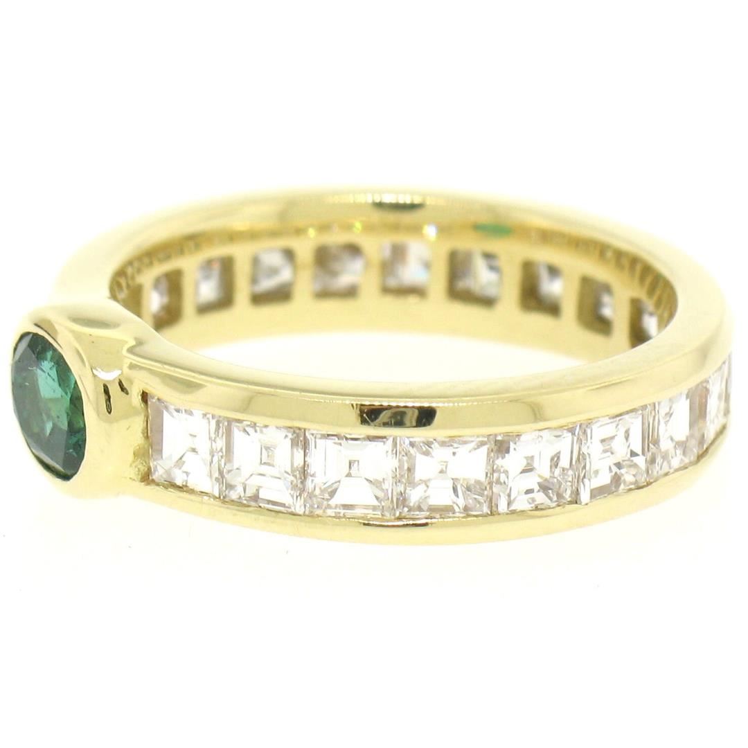 An estate solid 18k yellow gold sideway eternity solitaire ring, with 1 oval cut natural emerald (0.40ctw), and 21 square step cut natural diamonds (D/E - VVS1/VVS2; 4.00ctw). The ring is size 5.5, weighs a total of 4.61 grams, and measures 4.55mm wide.