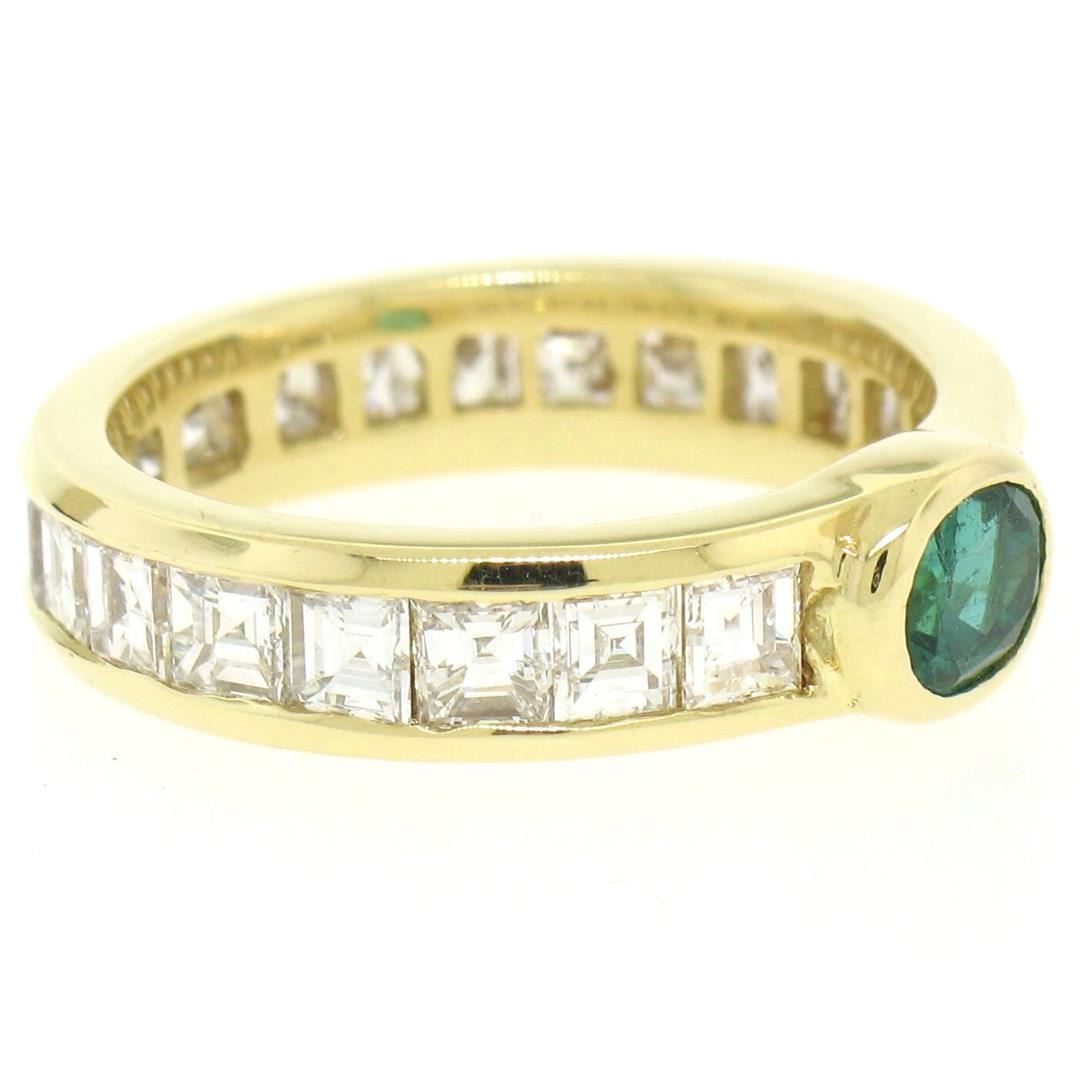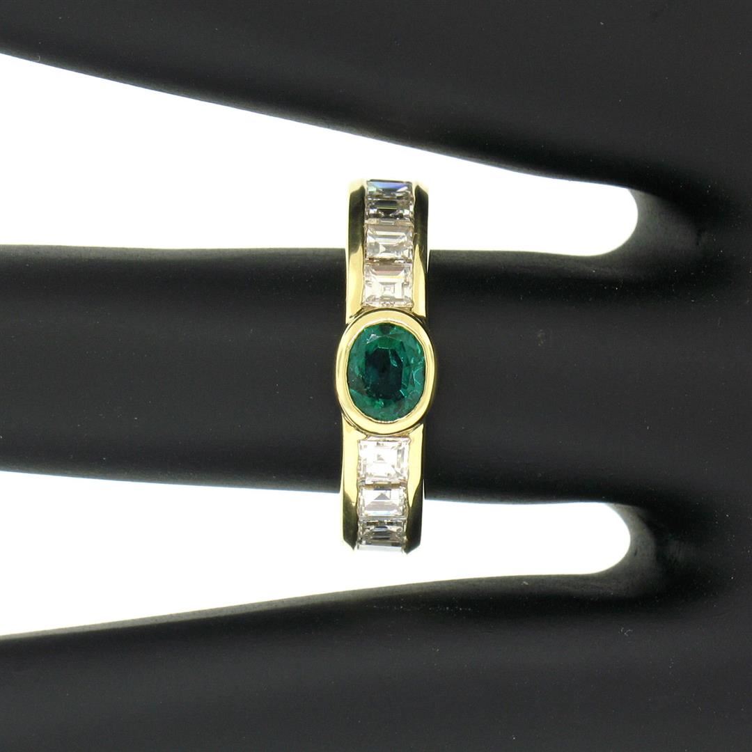 An estate solid 18k yellow gold sideway eternity solitaire ring, with 1 oval cut natural emerald (0.40ctw), and 21 square step cut natural diamonds (D/E - VVS1/VVS2; 4.00ctw). The ring is size 5.5, weighs a total of 4.61 grams, and measures 4.55mm wide.