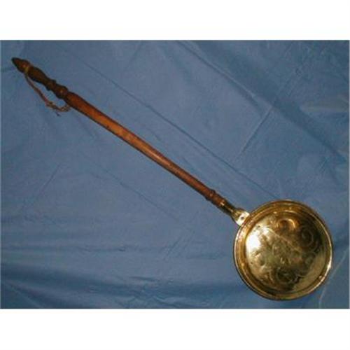 This is a fine antique 18th century chased brass warming pan or bed warmer. The overall length of it is 44" and the diameter of the pan is 12"....The original handle is very well turned and it has a nicely chased cover. This warming pan is in excellent condition and would be a nice compliment to your fireplace.