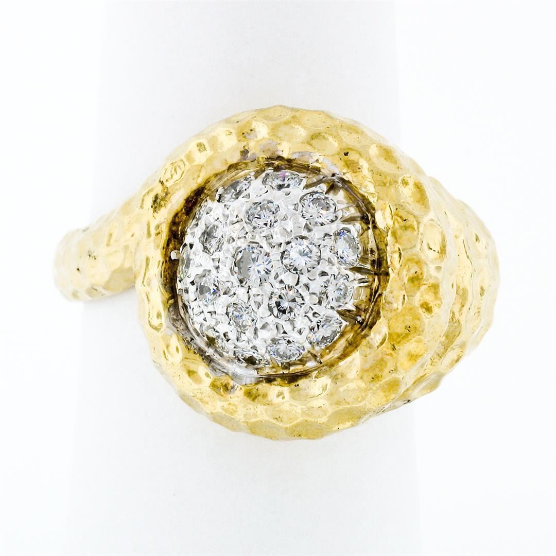 An estate solid 18k yellow & white gold cocktail ring by R. Stone, with 19 round brilliant cut natural diamonds (E/F - VS1/VS2 ; 0.45ctw). The ring is size 6.5, weighs a total of 12.80 grams, and measures 17mm wide.