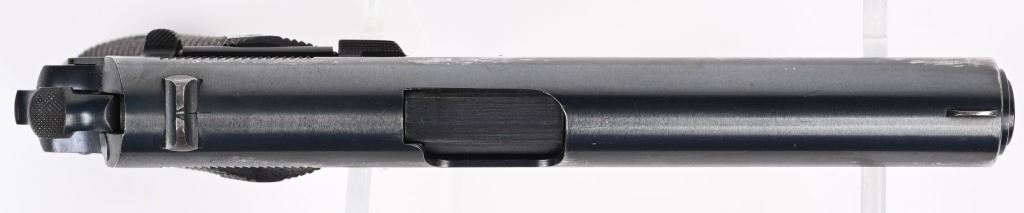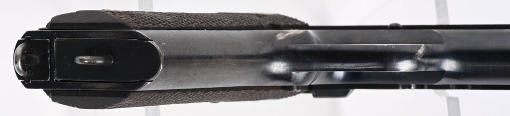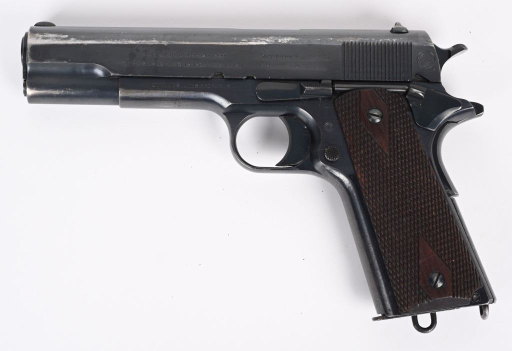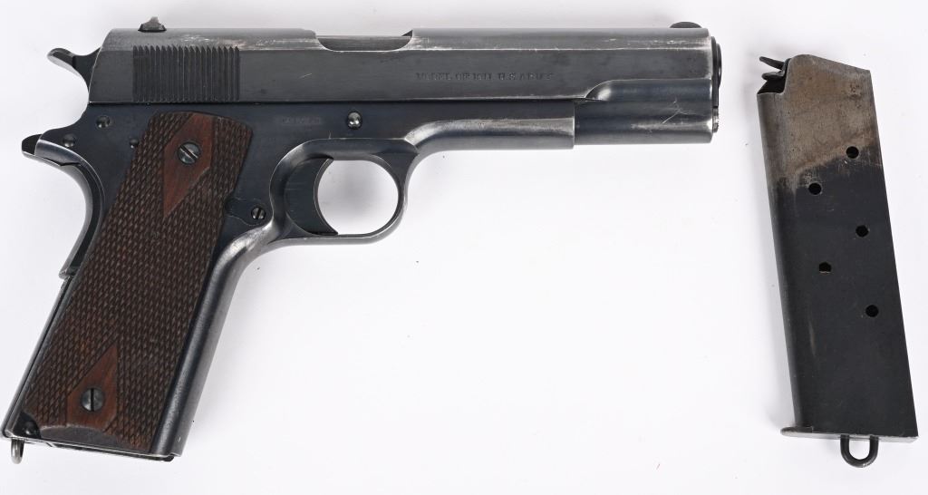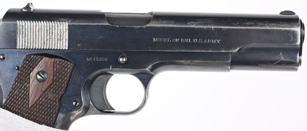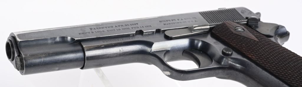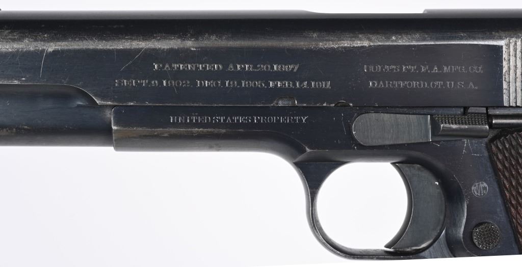 SERIAL NUMBER 15300 BARREL 5" CALIBER .45 ACP MANUFACTURED 1912. Polished blue finish with diamond pattern checkered walnut grips. Inspected on left side of frame by Walter C Penfield and marked "UNITED STATES PROPERTY" on left side of frame. Slide has early 2 line patent and Colt Hartford address and Rampant Colt at rear of slide. Proper tapered narrow front sight and rounded rear sight. Left side of slide marked "MODEL OF 1911 U.S. ARMY" Barrel is correct early barrel with "H" marking at top rear of hood and no other markings. Pistol is correct in that it has no "VP" proof on trigger guard and has single "H" inspection on topside of frame. Long smooth trigger, Long wide checkered hammer, short spur grips safety and smooth flat mainspring housing. Complete with early lanyard loop equipped key-hole slot magazine. A very uncommon pistol in its original as found configuration. CONDITION, Very fine with pistol retaining over 85% blue finish with losses at edges and period use. Bore is fair with oxidized grooves. Action operates properly. Magazine is good with slight staining at top. C&R