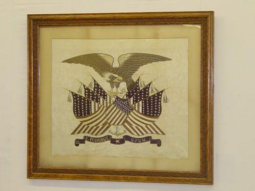FINE 19TH CENT. OAK FRAMED NEEDLEWORK OF AMERICAN EAGLE W/ U.S. FLAGS & SHIELD W/ BANNER E. PLURIBUS UNUM, MATTED (19 1/2" X 23" SIGHT) - SOME FADING & IMPERFECTIONS