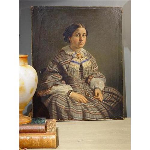This handsome portrait depicts an elegantly dressed young woman, the piece dates to the mid-19th C. The work was discovered in The Netherlands outside Amsterdam. Finely painted with wonderful detail, the portrait shows a seated woman adorned in her finest dress and jewelry. Wearing a broach, earrings, bracelets on both arms and a necklace on a long silk cord, the painting reflects the subject's status in society. The work is not signed, but clearly executed by a very accomplished artist. The horizontally striped dress is skillfully rendered, balancing the complicated stripes with the folds and drape of dress.