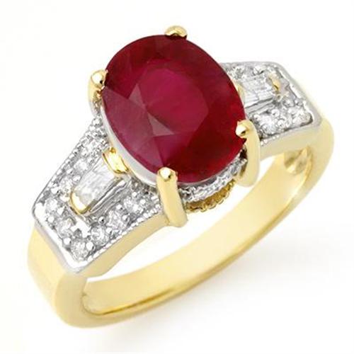 Become lost in the nuance of passionate color with this ruby and diamond two-tone gold ring. This elegant design begins with an oval red ruby prong set in the center. On either side decorated by baguette and round shaped diamonds<BR><BR>This July birthstone is believed to bring courage, power, and good fortune to its owner because of the glowing red color.