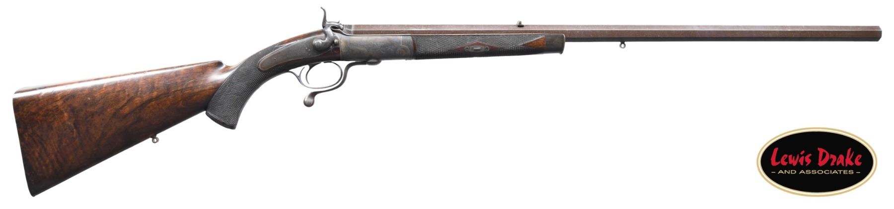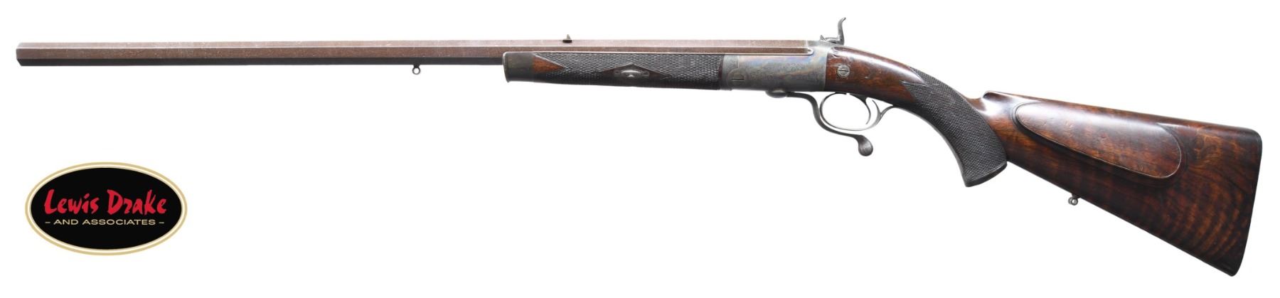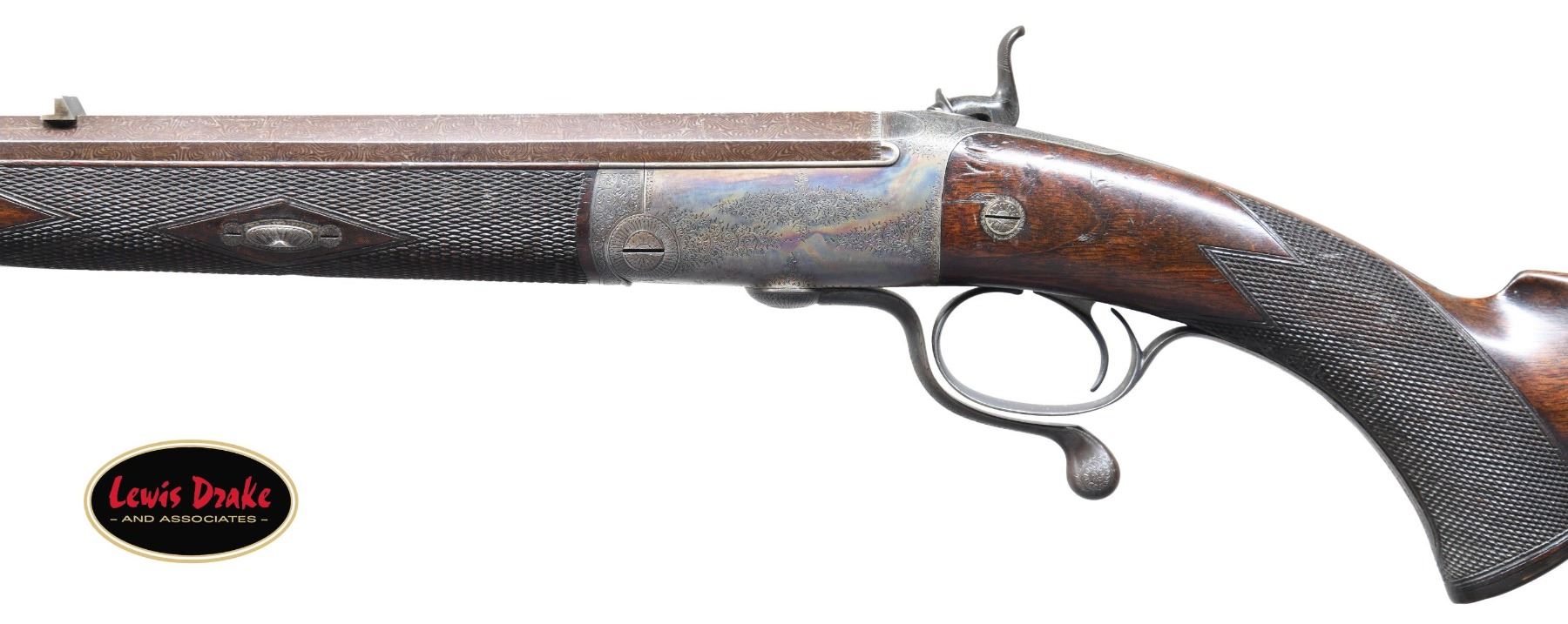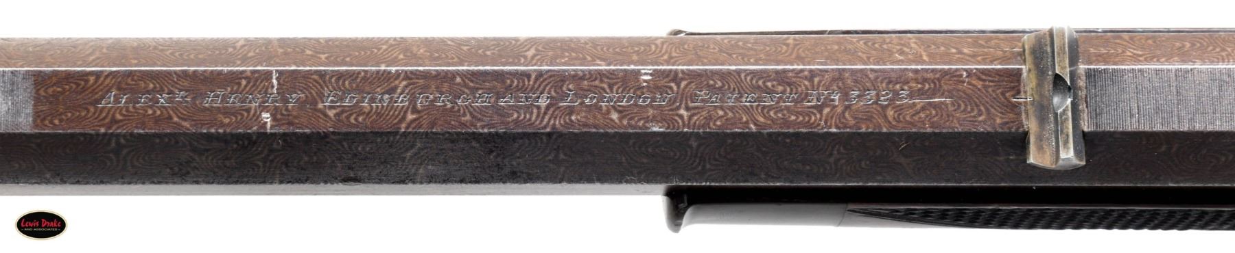 RIFLE. Cal. 40 Krag. S# 4291 (1878). Factory records indicate that this rifle was a best quality single shot made in 1878 in 500/450 caliber. Barrel has been invisibly sleeved to 40 Krag. The 27" tapered octagon damascus barrel is fitted with one standing leaf rear and square bead white front sight. Top of barrel is engraved "Alexr Henry Edinburgh and London. Patent No. 3323". (Rifling use number.) Case hardened Jones underlever action is fitted with back spring lock with non-rebounding serpentine hammer and front stalking safety. Action is engraved with 60% coverage well cut scroll. Maker's name is on lock. Horn capped pistol grip buttstock made of very nicely figured and marbled European walnut measures 14-3/8" over checkered wood butt with engraved steel heel and toeplates. Stock features classic Henry double shadow line right hand cheekpiece and point pattern grip checkering. Matching splinter forend with horn tip attaches to barrel with side bolt through shaped and engraved steel escutcheons. CONDITION: exceptionally fine. Barrel retaining over 90% original brown with some scratches and marks. Action and lock retain 90% original case hardening color. Stocks retain nearly all of their original finish with a fair scattering of light marks. Re-lined bore is bright sharp and shiny. Action is tight. Lock is crisp. PROVENANCE: from the renowned collection of quality sporting arms from Lewis Drake together with inventory of Lewis Drake Associates. (01-26232/MGM). ANTIQUE. $2,500-5,500.