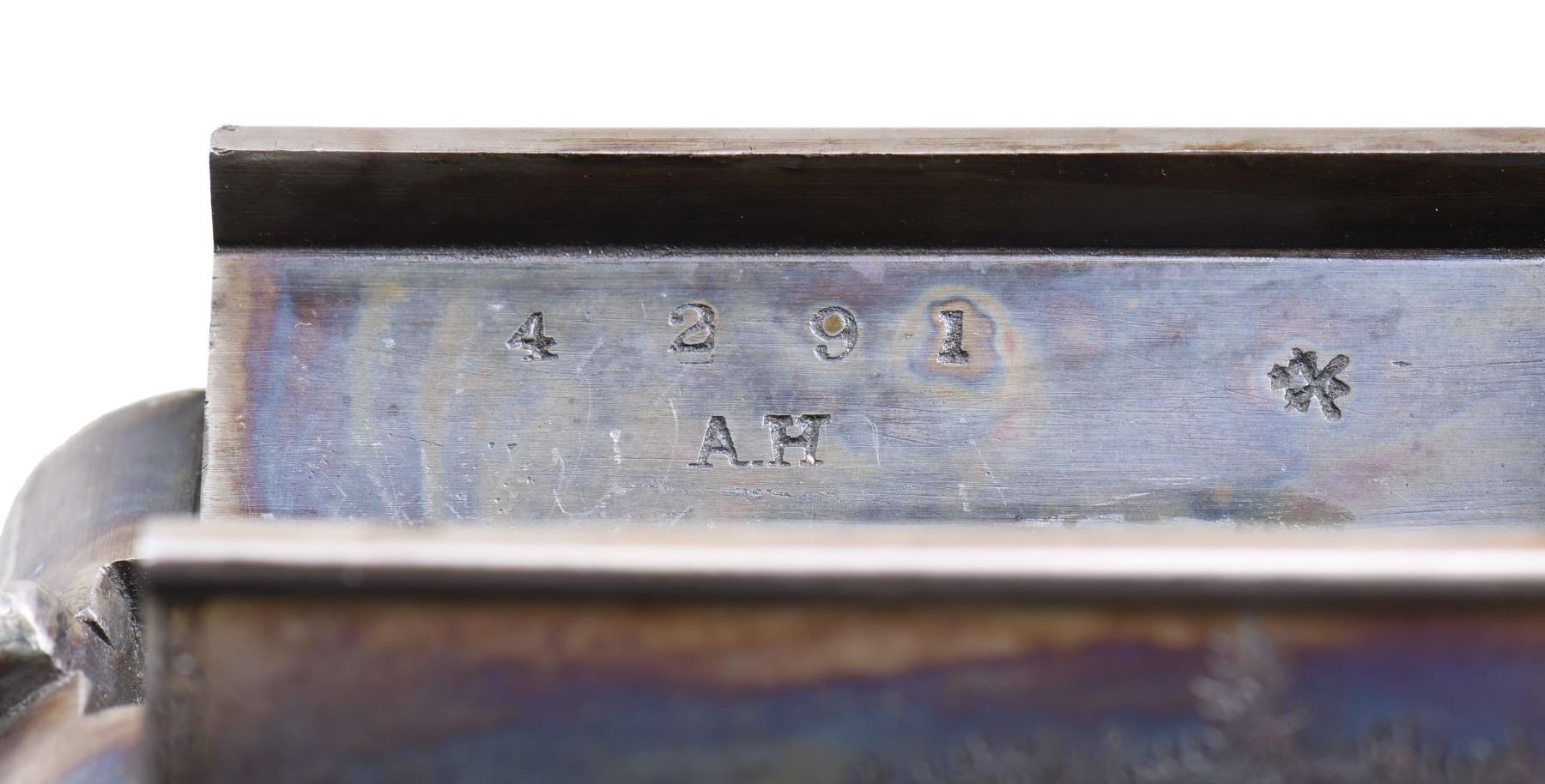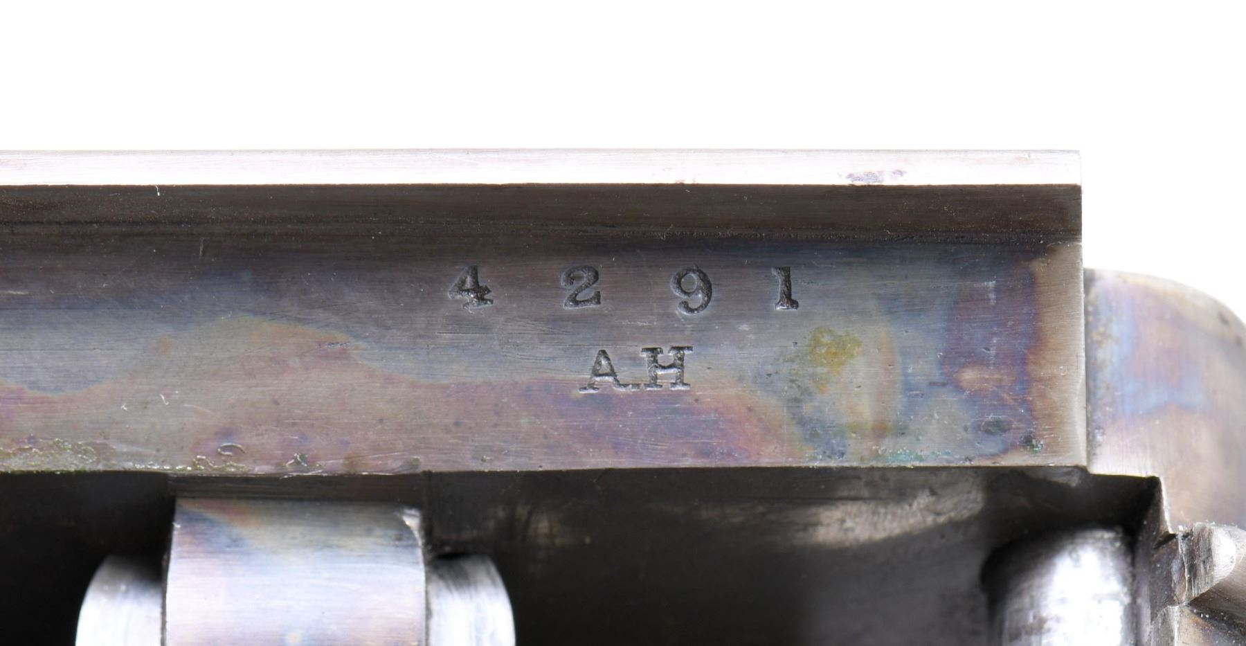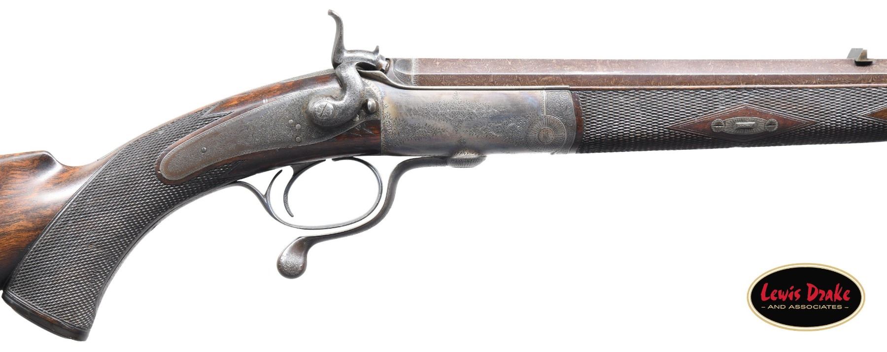 RIFLE. Cal. 40 Krag. S# 4291 (1878). Factory records indicate that this rifle was a best quality single shot made in 1878 in 500/450 caliber. Barrel has been invisibly sleeved to 40 Krag. The 27" tapered octagon damascus barrel is fitted with one standing leaf rear and square bead white front sight. Top of barrel is engraved "Alexr Henry Edinburgh and London. Patent No. 3323". (Rifling use number.) Case hardened Jones underlever action is fitted with back spring lock with non-rebounding serpentine hammer and front stalking safety. Action is engraved with 60% coverage well cut scroll. Maker's name is on lock. Horn capped pistol grip buttstock made of very nicely figured and marbled European walnut measures 14-3/8" over checkered wood butt with engraved steel heel and toeplates. Stock features classic Henry double shadow line right hand cheekpiece and point pattern grip checkering. Matching splinter forend with horn tip attaches to barrel with side bolt through shaped and engraved steel escutcheons. CONDITION: exceptionally fine. Barrel retaining over 90% original brown with some scratches and marks. Action and lock retain 90% original case hardening color. Stocks retain nearly all of their original finish with a fair scattering of light marks. Re-lined bore is bright sharp and shiny. Action is tight. Lock is crisp. PROVENANCE: from the renowned collection of quality sporting arms from Lewis Drake together with inventory of Lewis Drake Associates. (01-26232/MGM). ANTIQUE. $2,500-5,500.