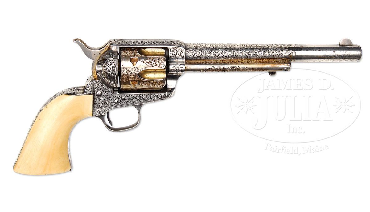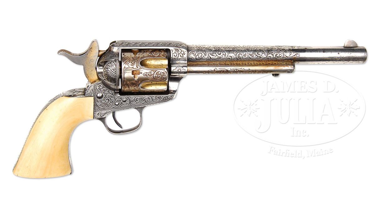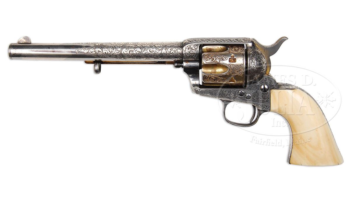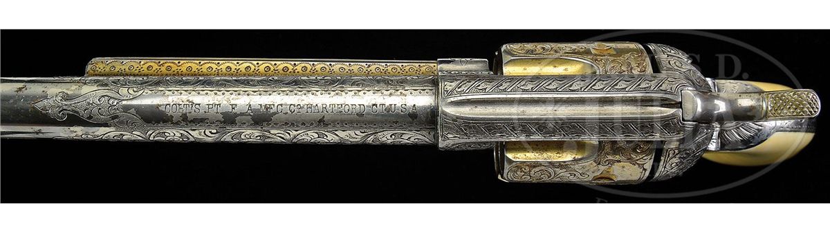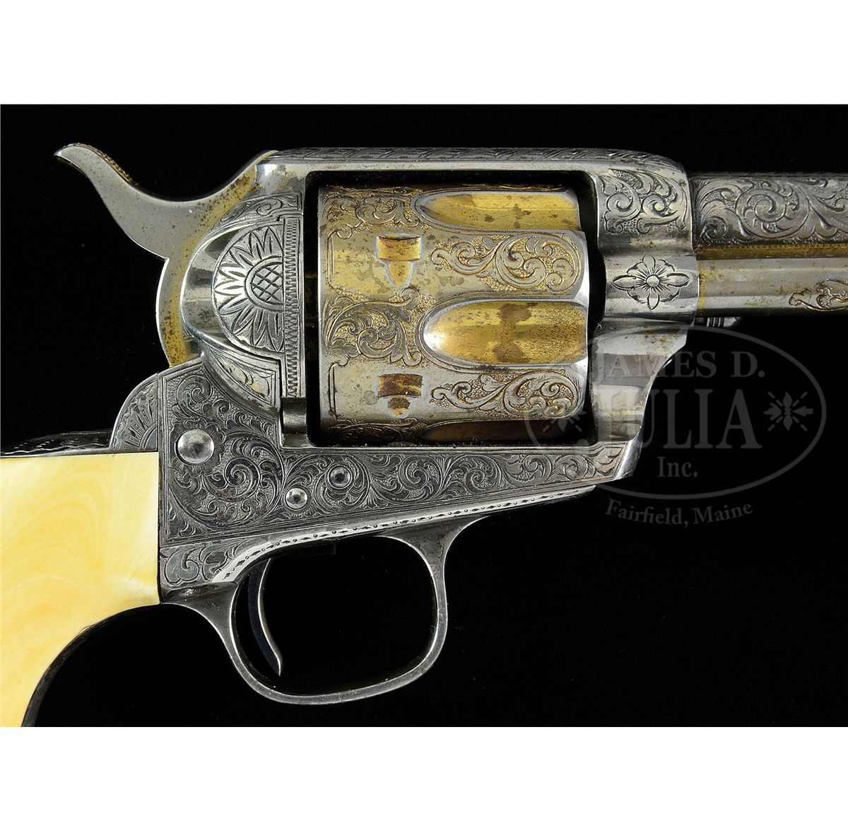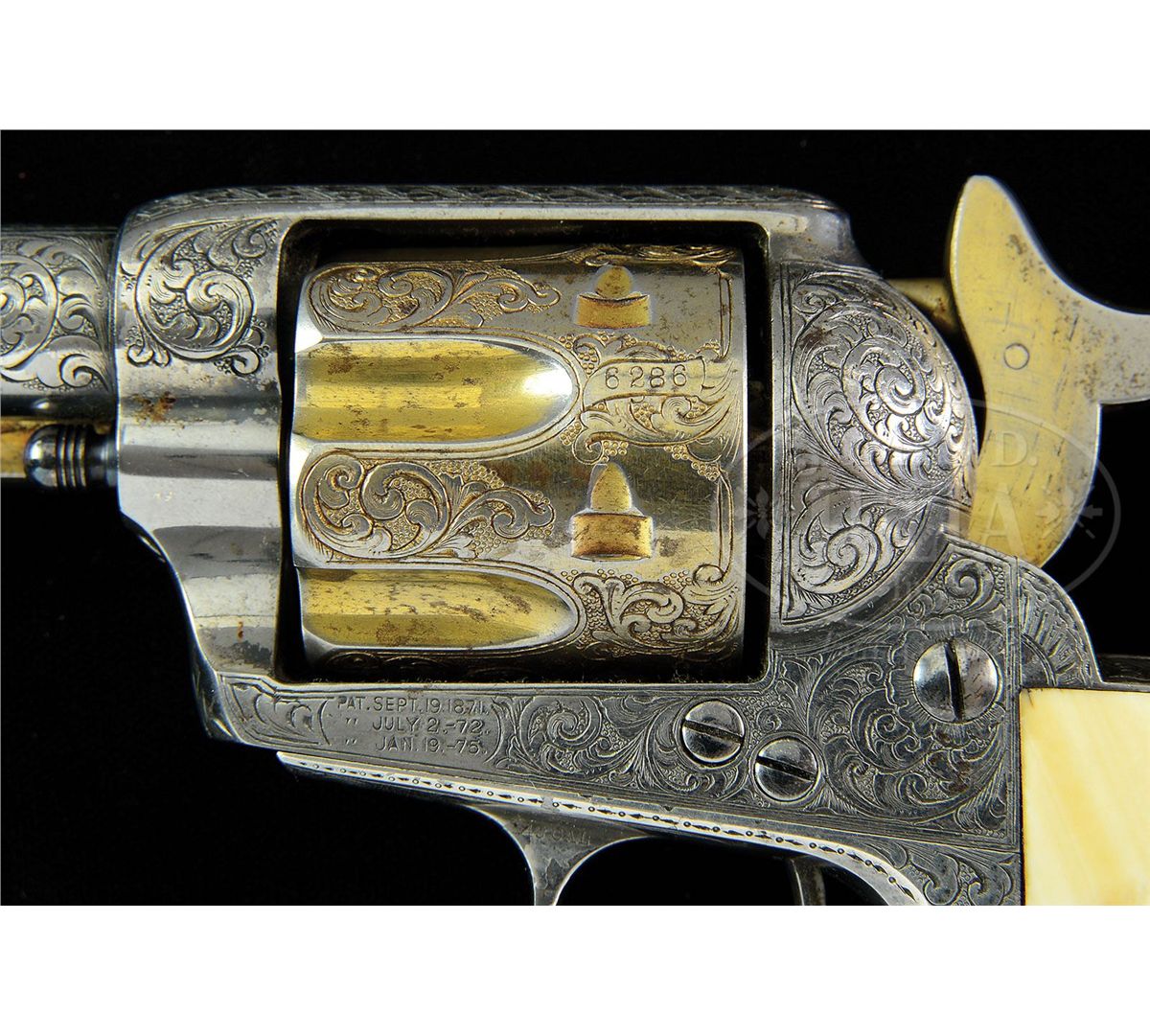SN 56286. .45 cal, 7-1/2" bbl with one-line maker and Hartford address marking on top; "45 CAL" on left side of front bow of triggerguard; three-line three patent date marking on left side of frame; silver-plated with gold-plated cyl, hammer and ejector rod housing; blued screws, cyl pin, ejector rod head and trigger; one-piece ivory grips. Profusely and finely scroll and border engraved on barrel, ejector rod housing, cyl, frame and gripstraps; ejector rod housing also with zig-zag lines and punched dot motifs; sunburst motif on top flat of backstrap. Note last four digits of serial number, 6286, on cyl within riband, in line with one of the flutes. Included is a Colt factory letter stating revolver left factory with silver finish and gold-finished cyl, ejector and hammer. Ivory grips. It was shipped on July 5, 1880 in a shipment of one gun to C.E. Gildea. CONDITION: Fine. 85% silver-plating, with tarnish, blemish near muzzle; light wear and spots patina; 75% gold,light wear and patina;50% blue; engraving sharp; grips very good to fine, rich, mellow patina; minor chipping and wear at butt and cracks visible on butt of grips. See R.L. Wilson, The Colt Engraving Book, volume I, chapter 10, page 416, where this revolver is pictured in color, with detailed description, identifying the work as by Cuno A. Helfricht himself. Wilson's The Colt Engraving Book, volume I, page 416, notes: "Considered one of the finest prewar Single Action Army revolvers known." 4-48349