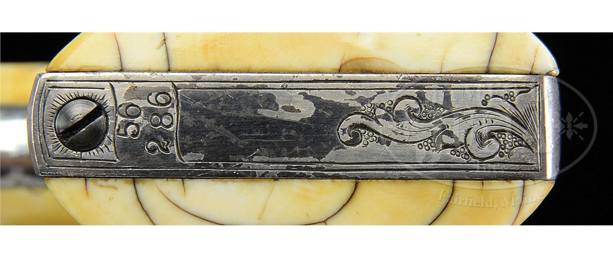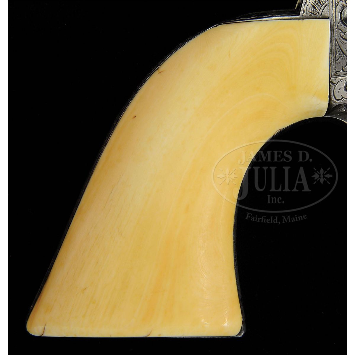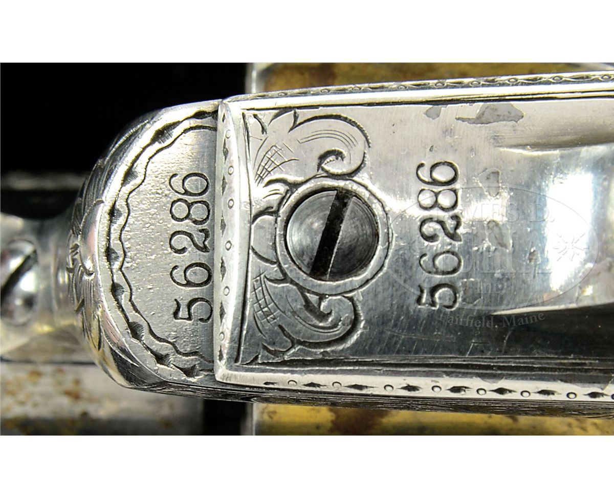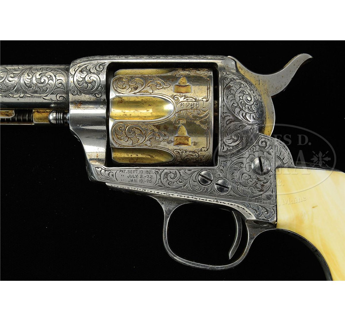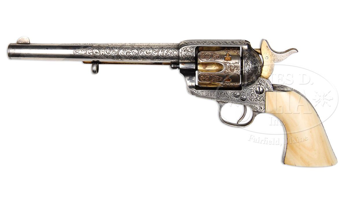SN 56286. .45 cal, 7-1/2" bbl with one-line maker and Hartford address marking on top; "45 CAL" on left side of front bow of triggerguard; three-line three patent date marking on left side of frame; silver-plated with gold-plated cyl, hammer and ejector rod housing; blued screws, cyl pin, ejector rod head and trigger; one-piece ivory grips. Profusely and finely scroll and border engraved on barrel, ejector rod housing, cyl, frame and gripstraps; ejector rod housing also with zig-zag lines and punched dot motifs; sunburst motif on top flat of backstrap. Note last four digits of serial number, 6286, on cyl within riband, in line with one of the flutes. Included is a Colt factory letter stating revolver left factory with silver finish and gold-finished cyl, ejector and hammer. Ivory grips. It was shipped on July 5, 1880 in a shipment of one gun to C.E. Gildea. CONDITION: Fine. 85% silver-plating, with tarnish, blemish near muzzle; light wear and spots patina; 75% gold,light wear and patina;50% blue; engraving sharp; grips very good to fine, rich, mellow patina; minor chipping and wear at butt and cracks visible on butt of grips. See R.L. Wilson, The Colt Engraving Book, volume I, chapter 10, page 416, where this revolver is pictured in color, with detailed description, identifying the work as by Cuno A. Helfricht himself. Wilson's The Colt Engraving Book, volume I, page 416, notes: "Considered one of the finest prewar Single Action Army revolvers known." 4-48349