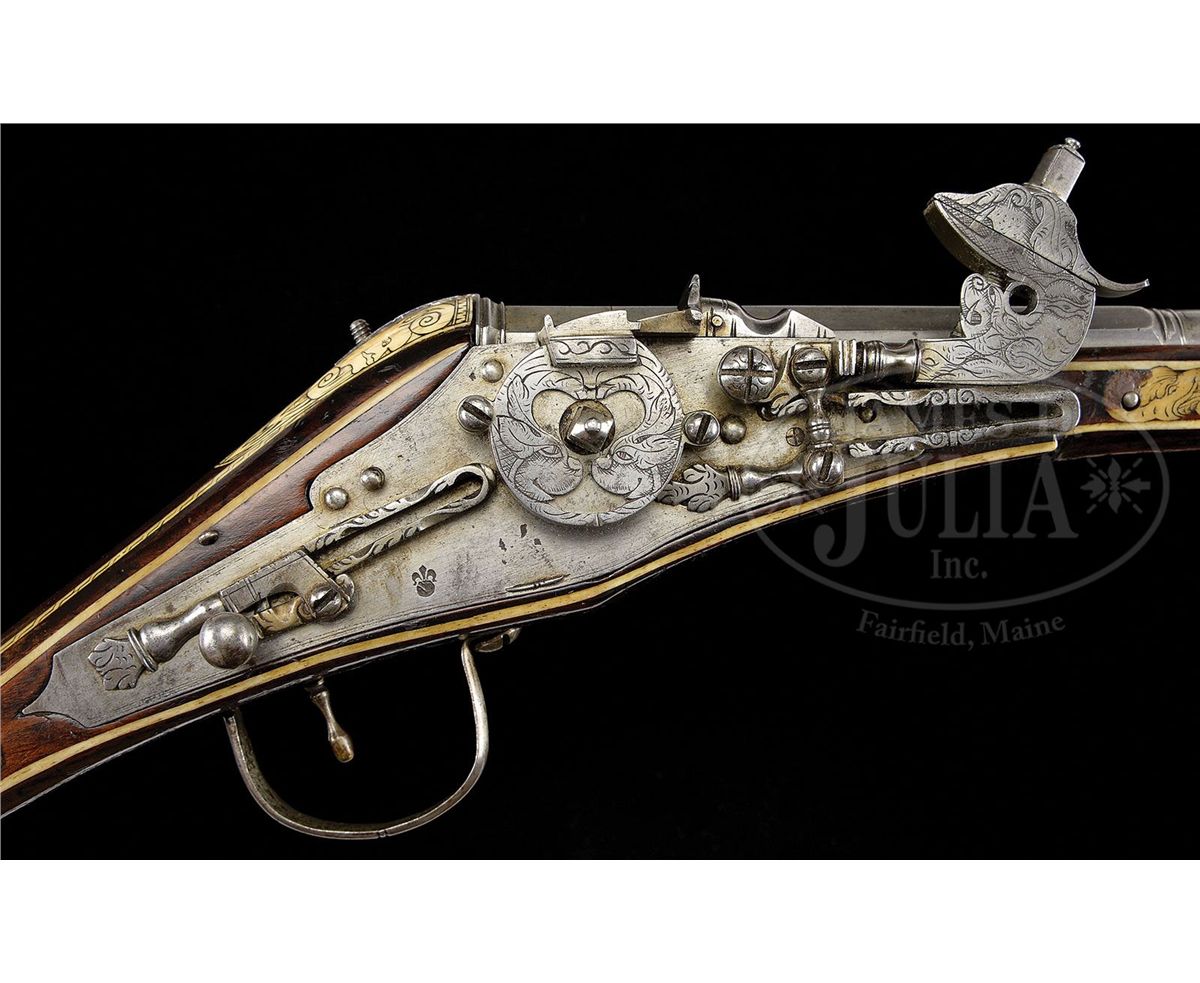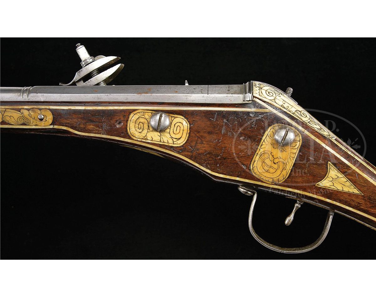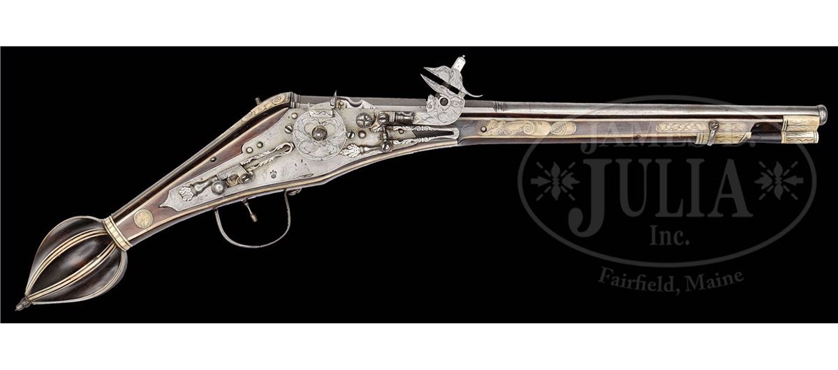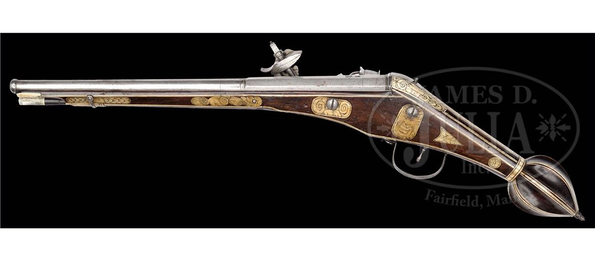 NSN. Two stage bbl with raised moldings at breech and muzzle. Breech deeply struck with maker's mark "WI" in a shield and crossed hammer and pick. Strasbourg control mark Stockel page 1702, no 8799 and horseshoe mark similar to Stockel page 1458, no 5100. Flat lock also struck with a Strasbourg mark. Flat wheel cover pierced and engraved with marine monsters. Dog engraved with further monsters and a grotesque. Push on safety with filed spring. Ebonized fruitwood full stock inlaid with contrasting horn stringing enclosing engraved horn plaques including strapwork scrolls issuing from monsters, a demon mask pierced by a side nail and further masks flanking bbl tang. Boldly fluted pommel with iron acorn finial, iron trigger guard, engraved horn ramrod pipe and wooden ramrod with engraved horn tip. NOTE: Sotheby's catalog mentions possibility that lock predates remainder, but it is entirely original to pistol. Genuine lemon butt pistols of this period are very rare. Most are Victorian creations. This pistol possesses an unusually distinguished provenance having been owned by four of the greatest and most knowledgeable collectors of the 20th century and represents an opportunity for today's collector to own something guaranteed genuine. PROVENANCE: See Visser Collection Sale Catalog, Sotheby's 6/3/91, #51. Samuel James Whawell Collection, sold Sotheby's May 1927. Edward Hubbard Litchfield Collection, sold Park Bernet Galleries, NY December 1961, lot 261. Miguel Mujica Gallo, Museo del Oro, Lima, Peru. Hank Visser, sold Sotheby's Visser part 2, June 3, 1991. Collection of Dr. Douglas Sirkin. CONDITION: Metal is crisp with crisp engraving and virtually no pitting. Ebonized fruitwood full stock exhibits light wear, but inlays are crisp and scrimshaw still very strong. One very minor repair at rear side nail does not detract. Pistol appears homogeneous throughout. 4-50047 MZ24