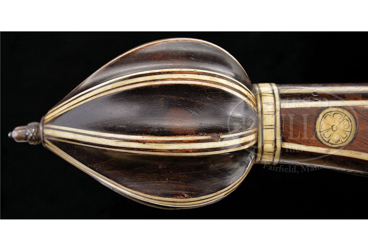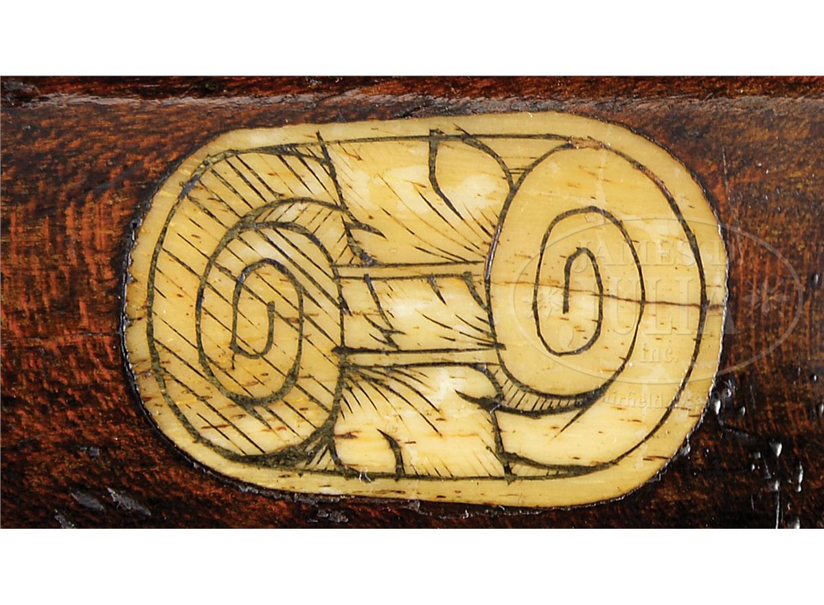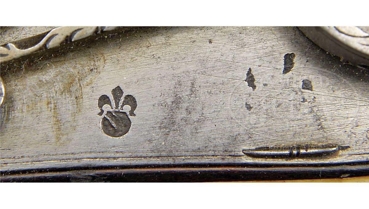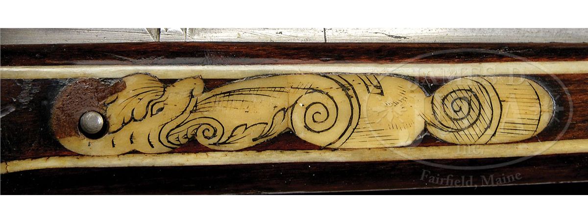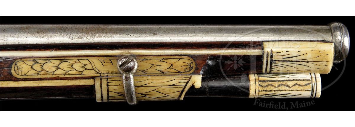 NSN. Two stage bbl with raised moldings at breech and muzzle. Breech deeply struck with maker's mark "WI" in a shield and crossed hammer and pick. Strasbourg control mark Stockel page 1702, no 8799 and horseshoe mark similar to Stockel page 1458, no 5100. Flat lock also struck with a Strasbourg mark. Flat wheel cover pierced and engraved with marine monsters. Dog engraved with further monsters and a grotesque. Push on safety with filed spring. Ebonized fruitwood full stock inlaid with contrasting horn stringing enclosing engraved horn plaques including strapwork scrolls issuing from monsters, a demon mask pierced by a side nail and further masks flanking bbl tang. Boldly fluted pommel with iron acorn finial, iron trigger guard, engraved horn ramrod pipe and wooden ramrod with engraved horn tip. NOTE: Sotheby's catalog mentions possibility that lock predates remainder, but it is entirely original to pistol. Genuine lemon butt pistols of this period are very rare. Most are Victorian creations. This pistol possesses an unusually distinguished provenance having been owned by four of the greatest and most knowledgeable collectors of the 20th century and represents an opportunity for today's collector to own something guaranteed genuine. PROVENANCE: See Visser Collection Sale Catalog, Sotheby's 6/3/91, #51. Samuel James Whawell Collection, sold Sotheby's May 1927. Edward Hubbard Litchfield Collection, sold Park Bernet Galleries, NY December 1961, lot 261. Miguel Mujica Gallo, Museo del Oro, Lima, Peru. Hank Visser, sold Sotheby's Visser part 2, June 3, 1991. Collection of Dr. Douglas Sirkin. CONDITION: Metal is crisp with crisp engraving and virtually no pitting. Ebonized fruitwood full stock exhibits light wear, but inlays are crisp and scrimshaw still very strong. One very minor repair at rear side nail does not detract. Pistol appears homogeneous throughout. 4-50047 MZ24