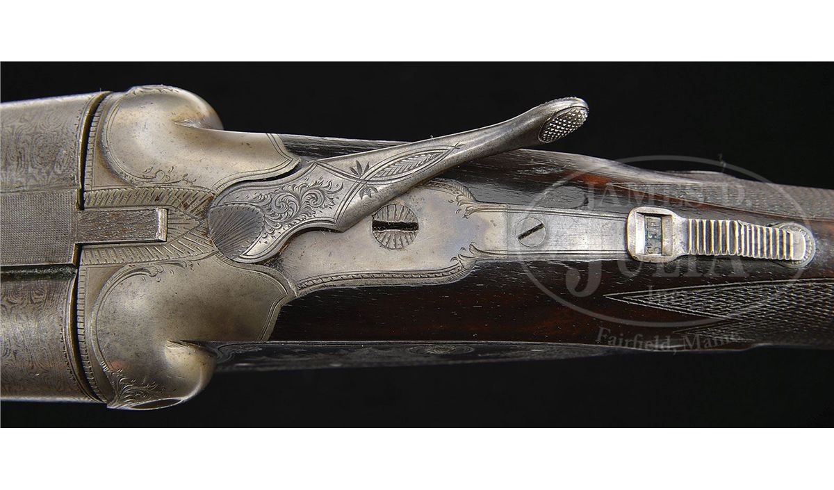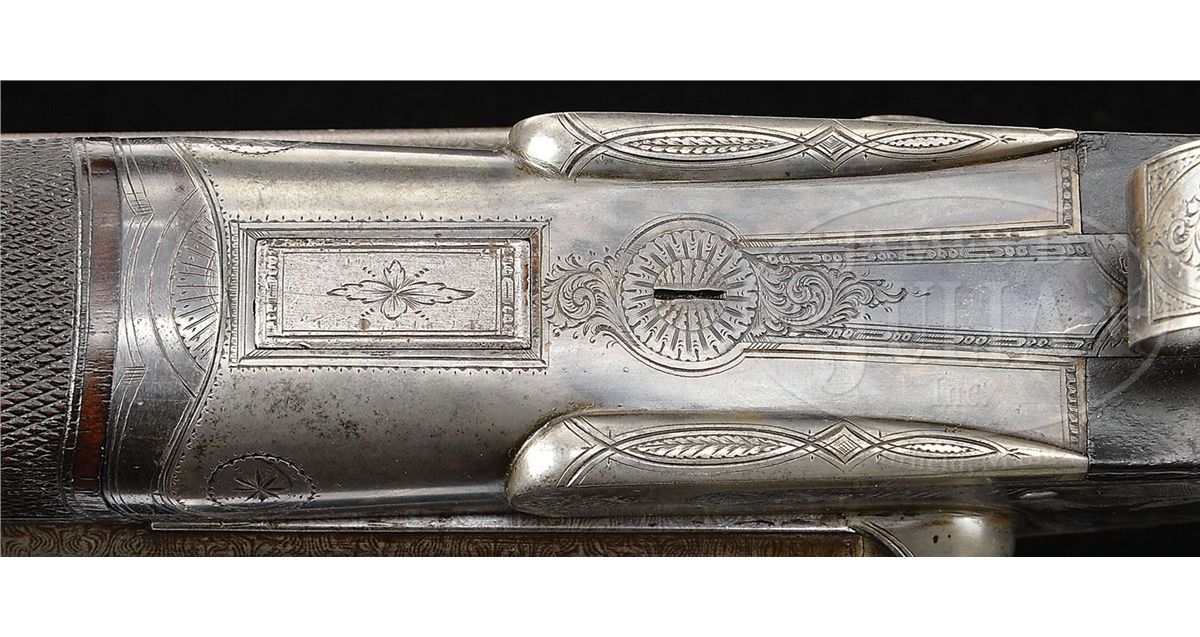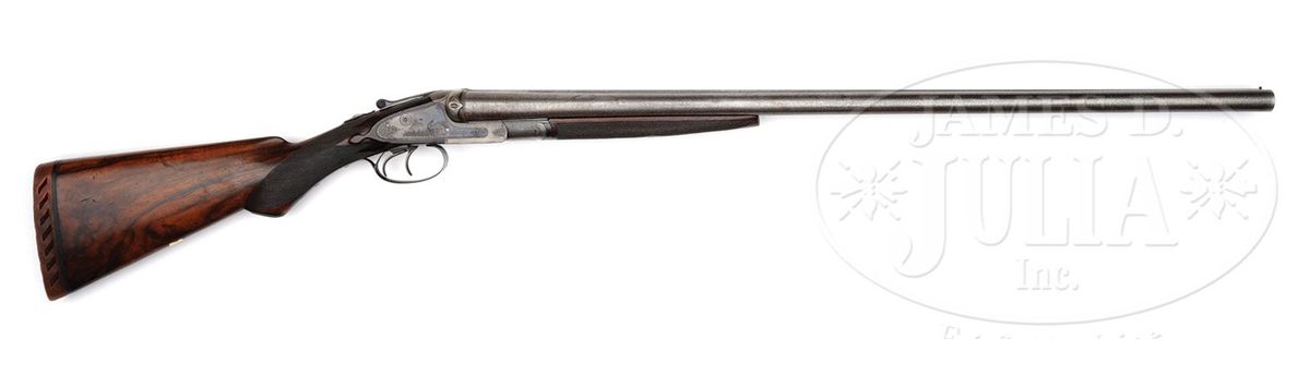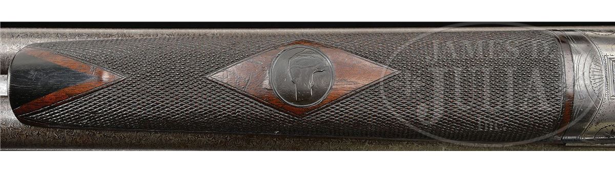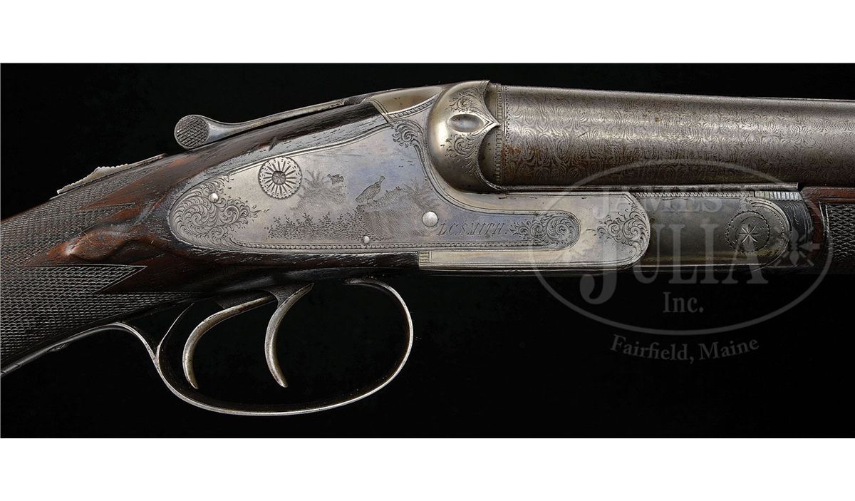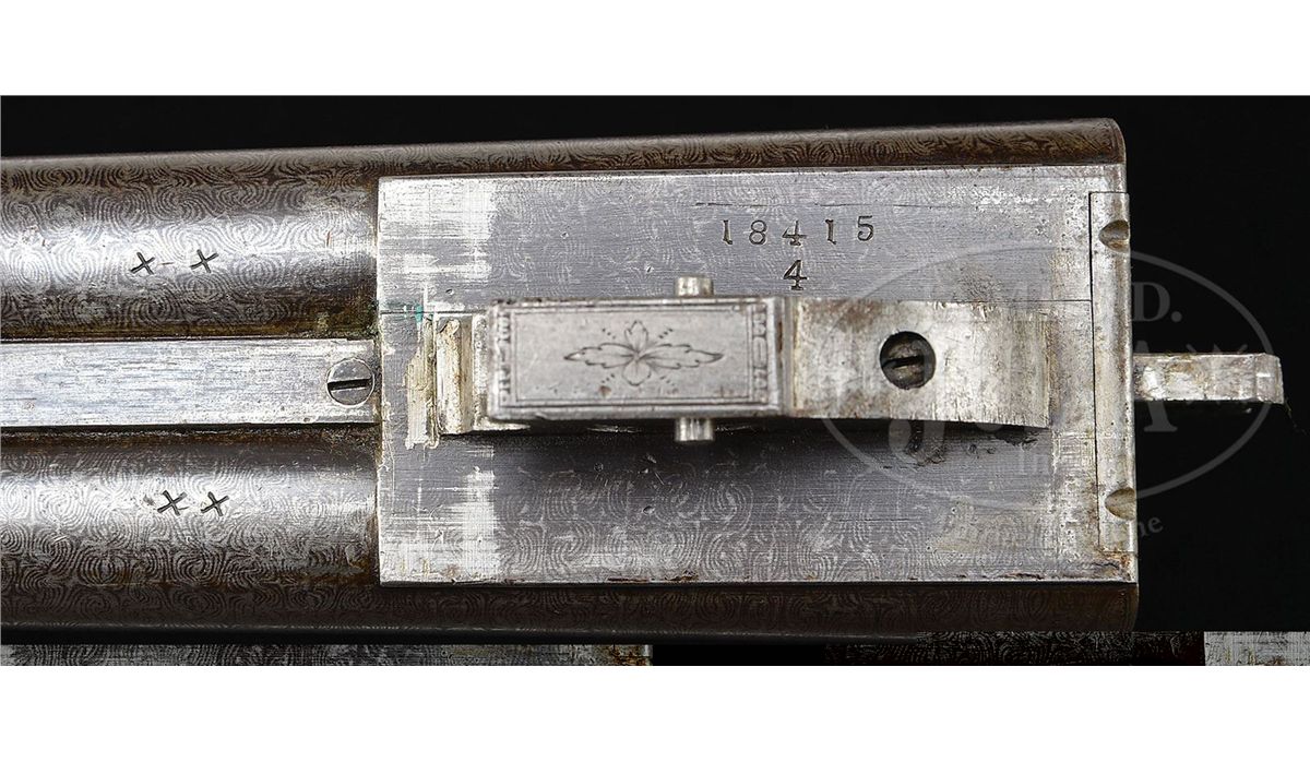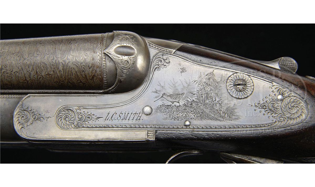 PLEASE NOTE (09-23-13) Forearm is a later Hunter Arms forearm, probably a factory replacement. SN 18415. Cal. 12 ga. 2-3/4" Chambers. 30" Bbls with broad, concave, matted rib are engraved "L. C. SMITH MAKER SYRACUSE N.Y." and "STEEL DAMASCUS" on tops. Bbl flats are stamped with SN and grade; bottoms of bbls with "XX". Case hardened action with L. C. Smith rotary bolt, has deeply scallop-carved fences, and is engraved with flourishes of well cut scroll, with geometric embellishment on well filed beads. Lockplates have scroll at front, top, and rear, with very fine detailed vignettes of game birds at center of each plate; a woodcock with woodland background and another woodcock falling from sky surrounded by a few floating feathers is on left. Right side depicts what appears to be a grouse perched on high bank, with another grouse flying in background. "L. C. Smith" is on front of each lockplate. Trigger guard has semi-relief oval vignette of setter on bow, and SN on tang. Classically marbled and lightly stump figured European walnut capped "Prince of Wales" grip buttstock measures 14-1/4" over old leather faced open sided pad. A vacant gold shield is on toe line. Drop points are behind side panels. A checkered hard rubber cap is on grip, and checkering is of multi-point pattern with line border. Matching splinter forend has dogs head central medallion and inlet triangular ebony tip. Bore diameter: left-.748, right -.740. Bore restrictions: left -.021 (Mod), right -.020 (Mod). Wall thickness: left -.039, right -.043. Drop at heel: 2-3/4", drop at comb: 1-3/4". Weight: 8 lbs. 4 oz. LOP: 14-1/4". CONDITION: Very fine. Bbls retain 75 - 80% orig Damascus finish, most loss due to cleaning on sides of right bbl, and normal carry wear. Action retains 50 - 60% muted orig case hardening color. Lockplates retain 90 - 95% stronger colors. Blue is quite strong on forend iron, and only traces of orig blue are on trigger guard. Stocks retain most of what appears to be their orig finish, grain slightly raised, and with a number of light marks and scratches, as would be expected from condition of remainder of gun. Bores are very fine, lightly frosted. Action is tight. Bbls are on face. 4-49298 MGM226