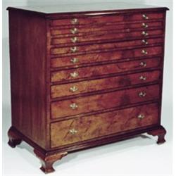 FINE AND UNUSUAL GEORGIAN STYLE WALNUT NINE-DRAWER PLAN/SPECIMEN CHEST, late 19th century, having a quarter veneered crossbanded top, fitted with four shallow upper specimen drawers over five long graduated plan drawers, raised on ogee bracket feet; 48 inch height; 46 inch width; 27 inch depth