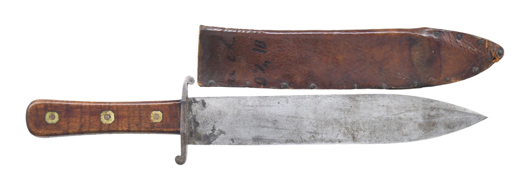 Pictured on page 136 of James R. Johnston's "Accoutrements V". 13.5" overall, 9" spear point blade, .2" thick with 3" false edge, full tang, coffin formed maple slab handle attached with iron pins and German silver hand made octagonal escutcheons, 3" "S" shaped cross guard. Sheath is re-purposed polished brown leather with pinned edging and belt loop. This knife was made by craftsman with excellent skills in every aspect of knife making and it has survived in very fine condition. CONDITION: fine overall, blade is gray/bright, old sharpening, good point, grip has hand worn patina, sheath is fine with 2" open seam on top edge. (02-23989/JS). NON-GUN. $2,000-3,000.