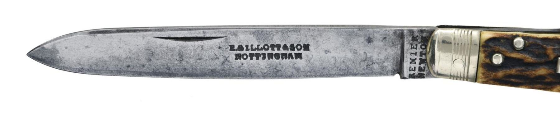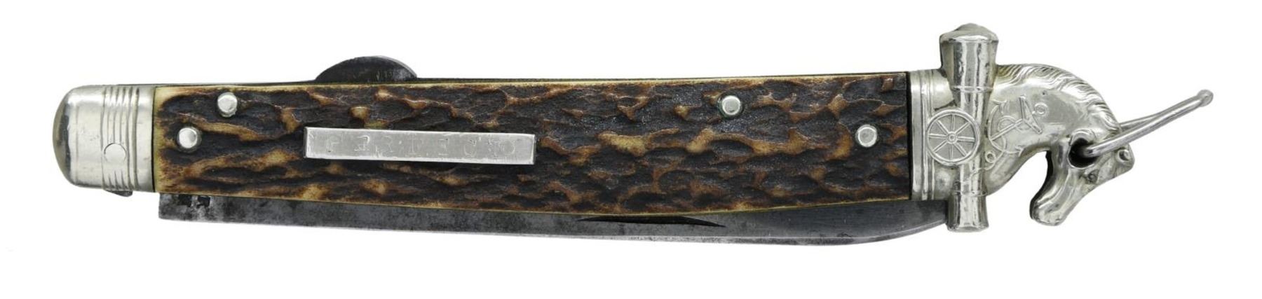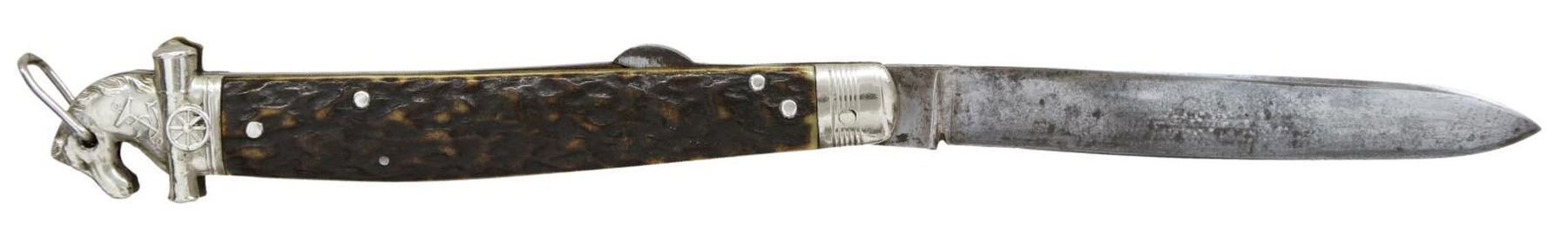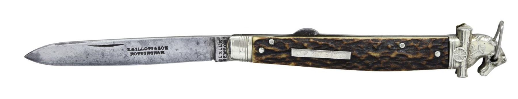 8.5" overall opened, 3.5" spear point blade marked "E GILLOTT & SON / NOTTINGHAM" horizontally, and "[P]REMEIR / NEWTON" on ricasso. Stag slab grips, German silver mounts including iconic figural horsehead over cannon with anchor pommel. CONDITION: very good-fine overall, markings are crisp, gray blade, slightly loose, escutcheon has indiscernible name. PROVENANCE: William "Bill" Myers. (02-21296/JS). $4,000-5,000.