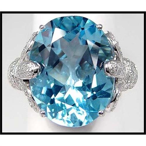 18K solid white gold (11.9 grams) as been formed by a master, and set with a gem aquamarine color topaz weighing 17.5 carats. This is a stone that exhibits the high brilliance that collectors seek. 84 full cut diamonds create superb contrast and exquisite color design. It measures 9mm (3/8") long. WE LOVE THIS RING!! Size 7. It was priced for $1450.