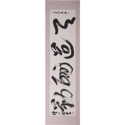 This is an original Chinese Calligraphy Scroll, hand painted by master artist Maestro Tanjianji. This piece displays the artist's energetic brus...