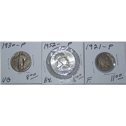 (3x$) THREE U.S COINS 1952-P FRANKLIN HALF DOLLAR, 1930-P STANDING LIBERT QUARTER, 1921-P INDIAN 5C.
