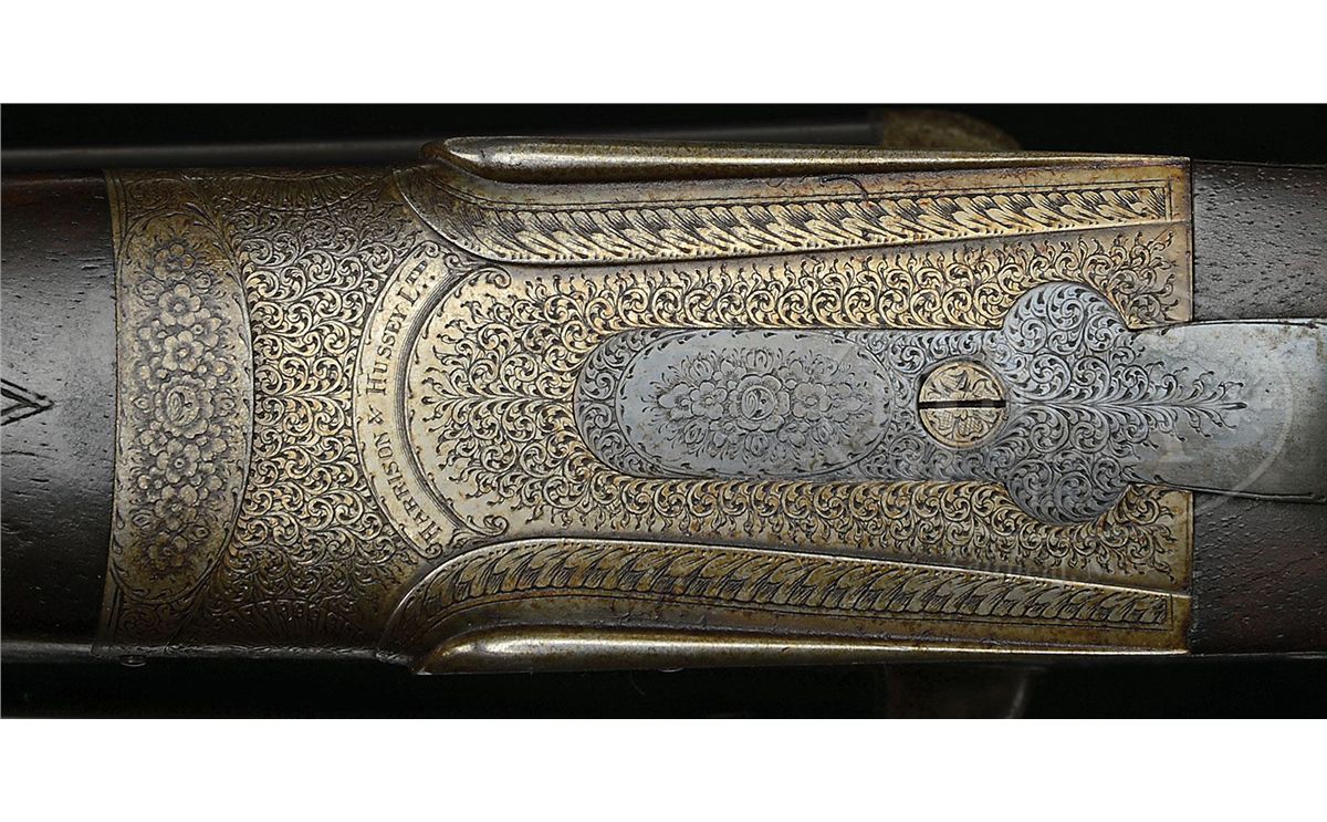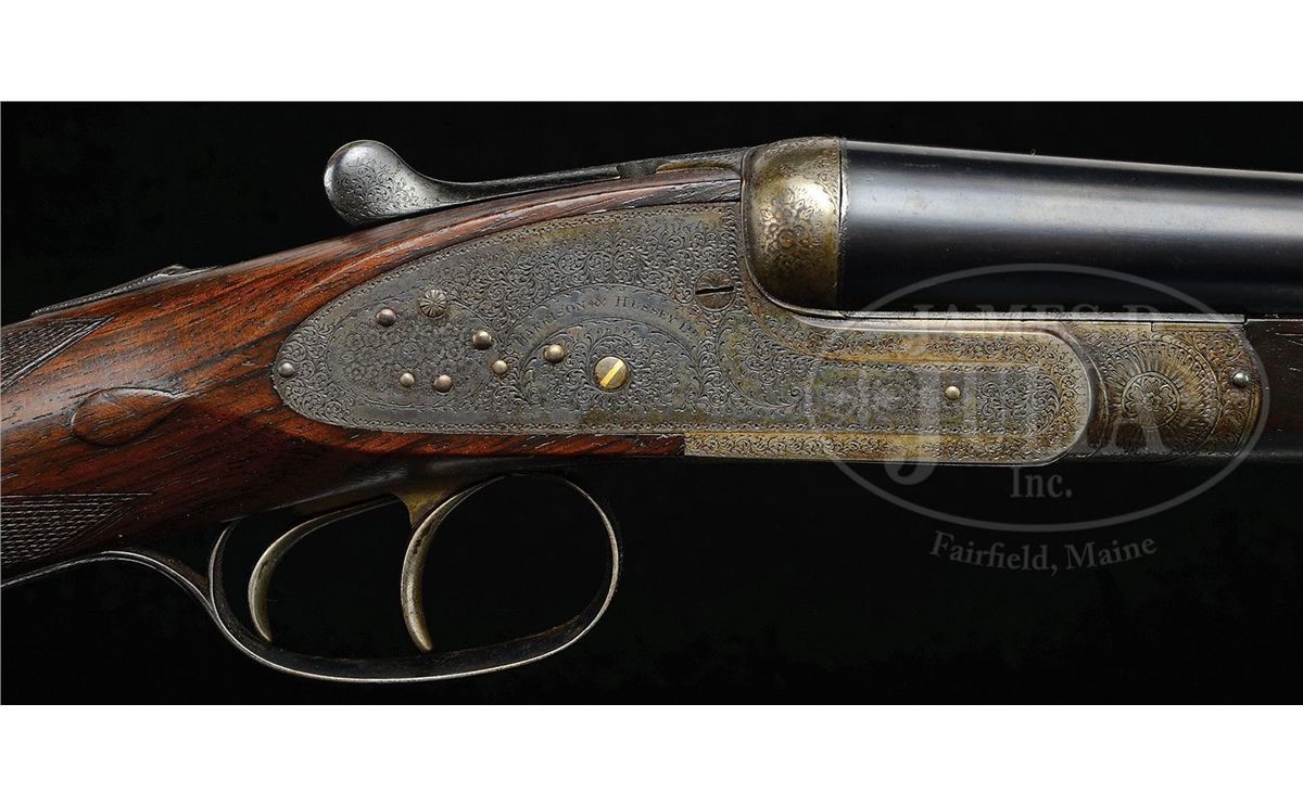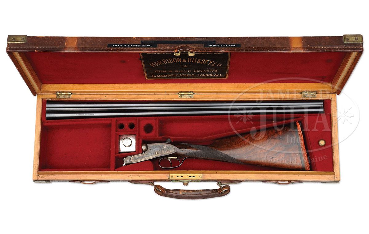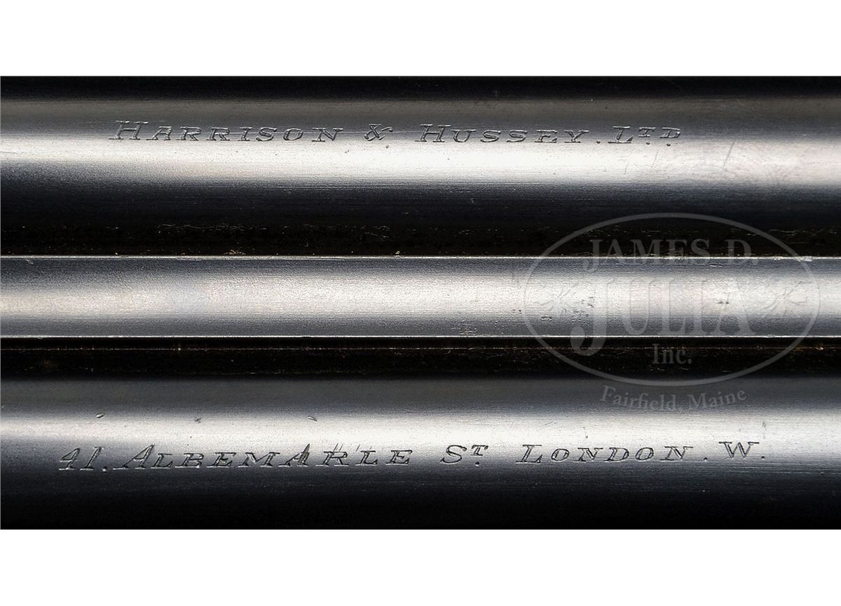 SN 2009. (ca 1923) Cal. 20 ga. 2-3/4" Chambers. 28" Chopper lump bbls with narrow game rib are engraved "Harrison & Hussey. Ltd." and "41 Albemarle St. London. W." on tops. Bbl flats are stamped with London nitro proofs for 7/8 oz of shot. SNs are on bottoms of bbls. Small case hardened full sidelock action is stocked to the fences, and features automatic safety (SAFE inlaid in gold), double triggers, and gold band tumbler end cocking indicators. Action and lockplates are engraved with exceptionally well cut, small, open, shaded scroll with rose bouquet highlights. "Harrison & Hussey Ltd" is in scroll flanked arch on each lockplate and on bottom of action. Safety, top lever, trigger plate, and trigger guard are blued, and engraved to match action. The quality of all engraving is exceptional, and most likely the work of Jack Sumner, noted engraver to the best London and Edinburgh trade. Well marbled European walnut stock with some burl figure at butt measures 13-5/8" over flattened Silver pad and features drop points, semi diamond hand, classic point pattern checkering with mullered borders, and a silver oval on toe line engraved "F. S. C". Matching splinter ejector forend has Anson release. Bore diameter: left-.614, right -.615. Bore restrictions: left -.015 (Mod), right -.000 (Cyl). Wall thickness: left -.025, right -.025. Drop at heel: 2-1/8", drop at comb: 1-9/16" (Stock is considerably swept at face (cast off) for a full faced individual). Weight: 5 lbs. 9 oz. LOP: 13-5/8". Maker's original oak and leather case with brass corners is embossed "F. S. C." on lid. Interior is lined in scarlet cloth with gold embossed black leather label on lid, and contains Harrison & Hussey marked square oil bottle, brass jag, and a wad of tow. CONDITION: Excellent, retaining a considerable amount of orig finish under a layer of old congealed oil and grime. Bbls retain over 90% blue. Action retains 40% color. Lockplates retain approx 90% color. Top lever and trigger guard are slightly silvered. Stocks have a number of minor marks and scratches in their orig finish, checkering slightly worn and somewhat dirty. Pad is petrified and squished. Bores are excellent, smooth, bright and shiny throughout, with one or two barely noticeable pings. There is a compression at breech end of right bbl from being dropped. (Should peen out) Action is tight. Bbls are on face. Ejectors are in time. Case leather has darkened, lightly crazed, and has numerous rubs. Handle and straps are good. Interior cloth shows slight insect damage, but considerable mildew which also affects over 50% of label. Should clean. Oil bottle is excellent. 4-49582 MGM27