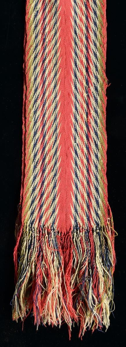 ALL: Pictured and described on page 180 in "The Fur Trade". Author Milton von Damm. CONDITION: very good overall. 1. Sash - " 80" Long, 5.75" wide." 2. " Sashes like this were first made in the village of Assomption near Quebec. They were first made about 1800 and were worn by men in the fur trade by wrapping them around their waist to "dress up". It took about 300 hours of finger weaving to make a single sash. By the end of the 1800's the Hudson's Bay Company was having them mass produced in England by looms." PROVENANCE: Lifelong Collection of author Milton Von Damm. (02-22235/JS). BOTH: $1,000-2,000.
