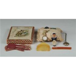 FINE ASSORTMENT OF FRENCH BEBE ACCESSORIES. Included with this grouping are two pair of gloves, an assortment of amber hair combs, two enameled watches, a silver locket, and two antique pins. SIZE: Varies. CONDITION: Overall very good. JL 1-4608 (200-250)