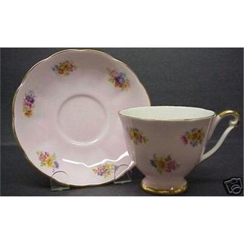 BEAUTIFUL FINE BONE CHINA TEA SET, MADE IN ENGLAND, NO NAME OF THE MAKER JUST A CROWN, IMAGE AVAILABLE ON REQUEST - LOVE THE SOFT PASTEL PINK BACKGROUND AND TINY BUNCHES OF FLOWERS IN A CHINTZ STYLE DECORATE THIS SET - EXCELLENT CONDITION FREE OF DAMAGE - PLEASE NOTE LOVELY PEDESTAL AND GOLD GILTED AND KIND OF UNIQUE HANDLE - THANKS FOR LOOKING!