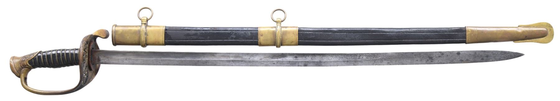 SWORD. 29" unstopped fuller blade, 1850 B&G style hilt with high copper content giving reddish patina to distinctive hilt with plain undecorated sides to quillon. Grip is polished black leather with single brass wire wrap. CONDITION: sword overall is fine, blade is smooth, gray, with a few nicks in cutting edge, good point. Hilt like blade is uncleaned with mottled patina, grip is near perfect with only a couple small chips in surface. The accompanying scabbard fits sword well and is in matching very good to fine condition but is not a product of Boyle & Gamble, protective washer has been added. PROVENANCE: Lifelong collection of Richard A. Baumann. (02-23350/JS). NON-GUN. $3,000-6,000.