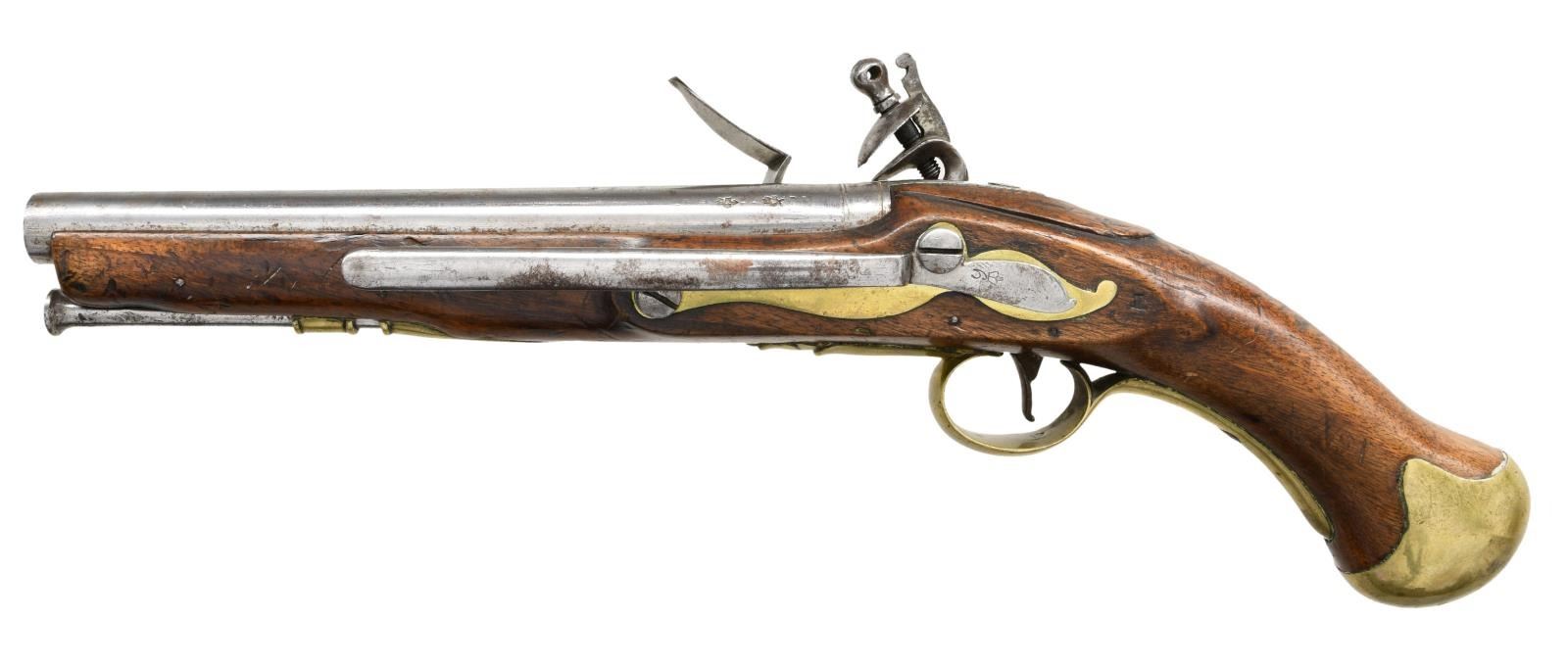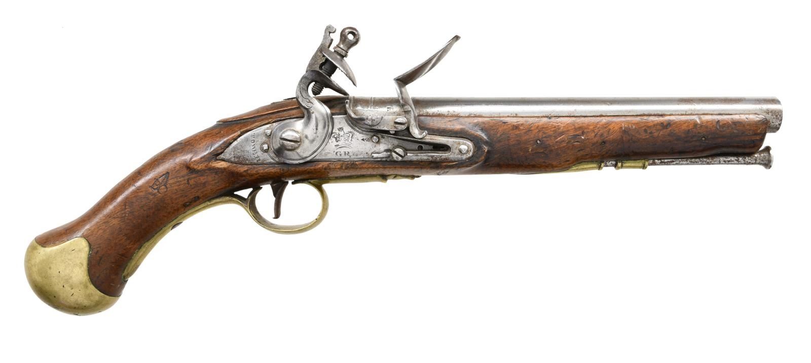 FLINTLOCK PISTOL. Cal. 58. NSN. Bbl. 9". 16.5"Overall, 1790s vintage original flint configuration, regulation 9" barrel, 6" belt hook, GR cypher, TOWER lock with broad arrow proof. Stock has large Board of Ordnance broad arrow proof. Brass furniture, iron ramrod. An attractive example in beautiful unmolested condition with excellent markings. UNATTACHED ACCESSORIES: collection card from Jim Taylor display. CONDITION: very good to fine, appears all original & matching, metal bright, good markings in metal & wood, mechanics fine, smooth clear bore. PROVENANCE: Ex-Bill Guthman. (01-23498/JSANTIQUE. $1,500-2,500.
