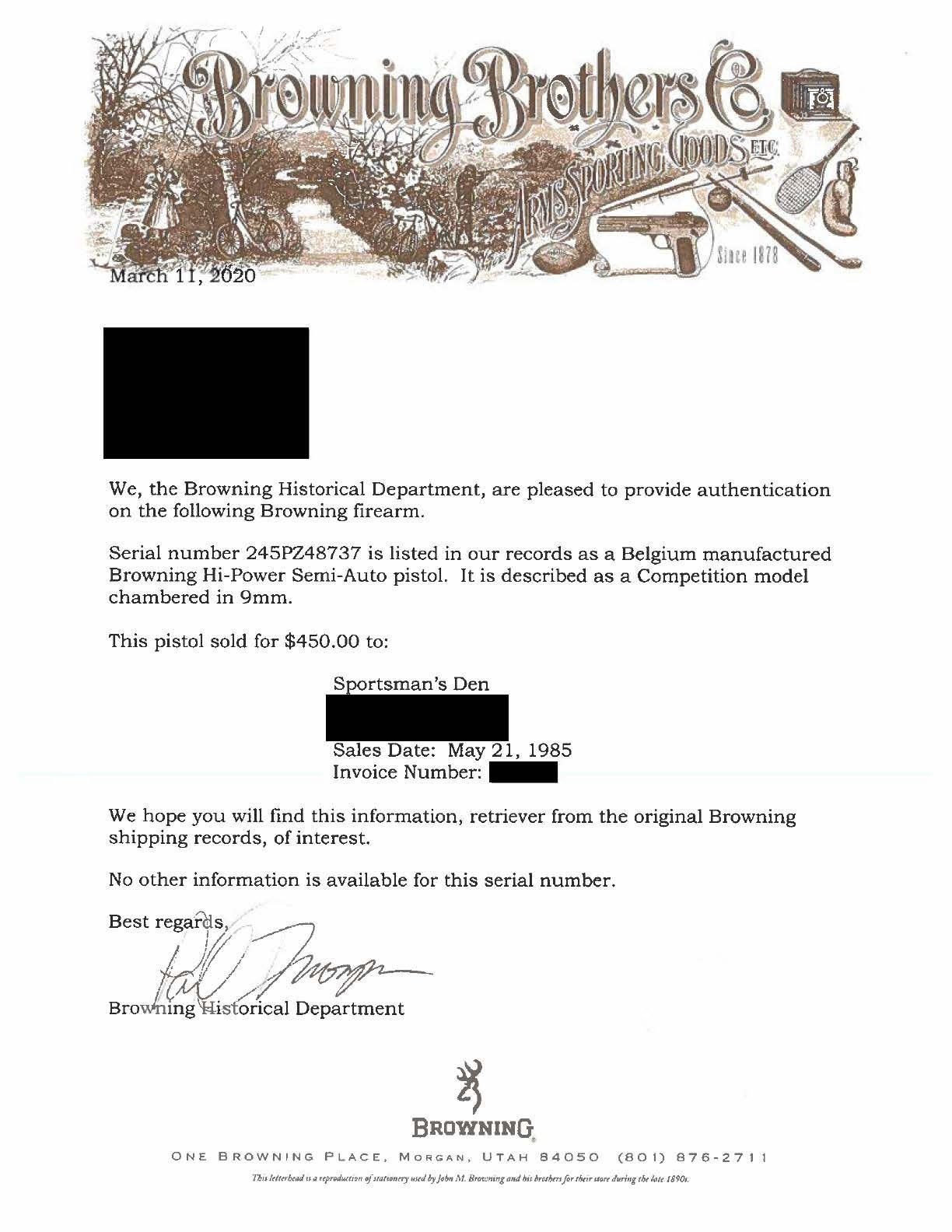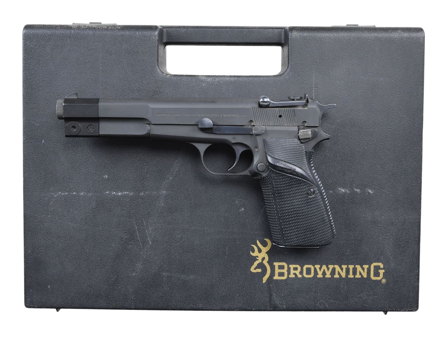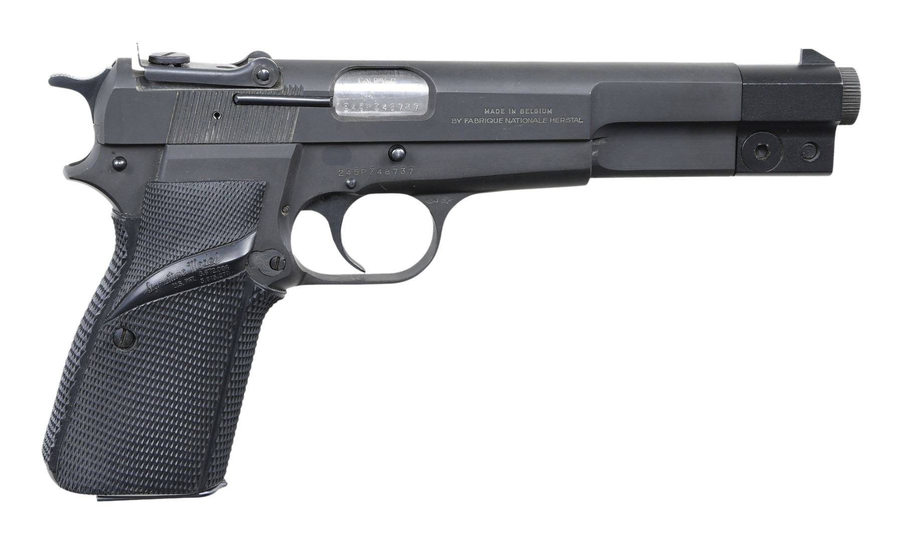 SEMI-AUTOMATIC PISTOL WITH HARD CASE & FACTORY LETTER. Cal. 9x19mm. S# 245PZ48737. Bbl. 6". Hi Power GP Competition semi-automatic pistol mfg. in Belgium and imported by Browning Arms Company in 1981. The left side of the slide is marked with Browning's importer information, with "MADE IN BELGIUM/ BY FABRIQUE NATIONALE HERSTAL" marked on the right. Frame and slide exhibit a phosphate finish, with small parts exhibiting a blue finish. 2-piece bbl. is polished in-the-white. Bbl. weight exhibits a black enamel type finish. Frame is mounted with a 1-piece Pachmayr Signature Model wrap around grip. Fixed high profile blade front sight (integral to bbl. weight), with adj. square notch rear sight. Matching numbers are present on the frame and bbl. MAGS: 2 13-rd. phosphate mags. UNATTACHED ACCESSORIES: factory hard case, containing a cleaning rod, bbl. weight removal tools, as well as 1 50-rd. box of Sellier & Bellot 115 grain Range Safe ammunition. Pistol is also accompanied by a factory letter, indicating that this example was sold for $450.00 to Sportsman's Den in Odessa, TX on May 21st of 1985 (Invoice #131477). CONDITION: fine, with metal components retaining bountiful amounts of their original factory finishes, exhibiting some very light wear on protected surfaces from cycling of the action, with some light edge wear present on the bbl. weight. Brilliant mirror bore, exhibiting well defined rifling throughout. Grip is excellent overall. Case shows some superficial marks from handling and storage, but otherwise remains sturdy and serviceable. PROVENANCE: From the Estate of Jon Thomas, Gunsport, LTD. (25-1135/MLW). MODERN. $1,000-1,500.