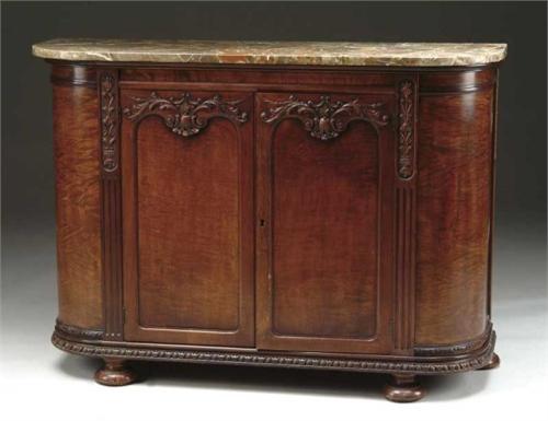 FINE CARVED MARBLE TOP TWO DOOR SIDE CABINET. The D-shaped multi-color marble top sits atop a D-shaped cabinet having two paneled doors with leaf carving. Behind which are four dovetailed linen drawers. Side fluted and carved columns. Deep carved molded base resting on bunn feet. Nice figured wood veneers. PROVENANCE: From a fine Hallowell, Maine mansion. SIZE: 37" h x 51" w x 17-1/4" d. CONDITION: Very good. 9-26890