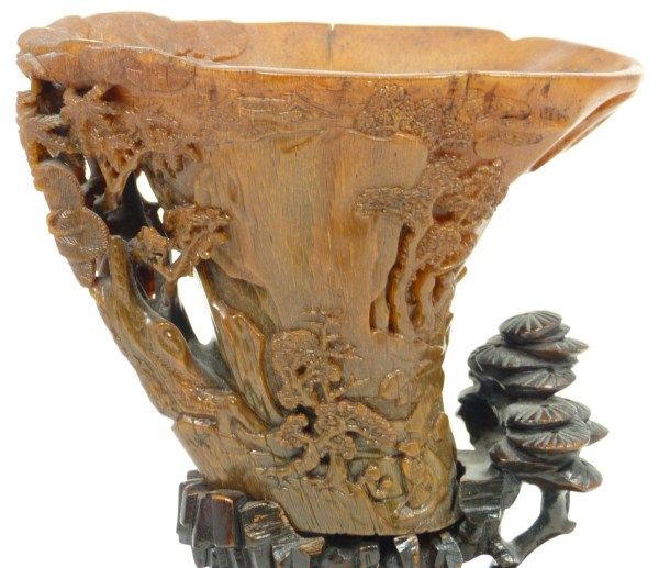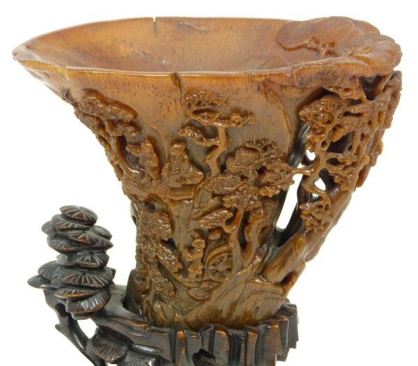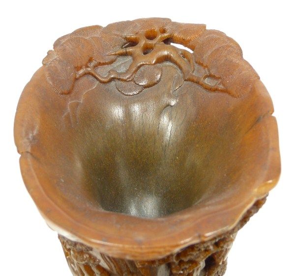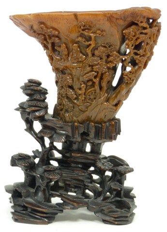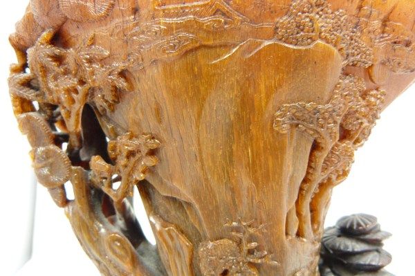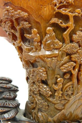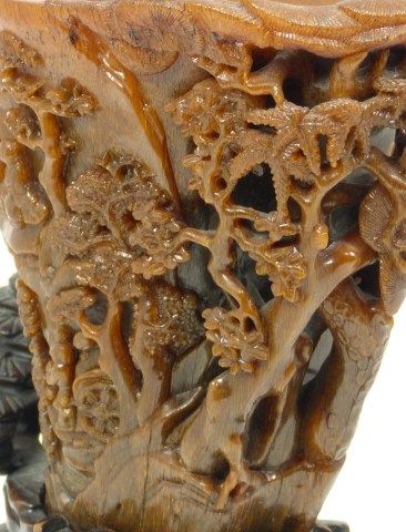 Rhinoceros horn of gently flaring form carved as a wooded jungle and rendered in high relief to depict a continuous scene of a finely relief carved village depicting trees, people working and resting along the base you will find the wagon, pagodas, clouds, and rock formations. One side depicting the scholars climbing the side of rock mountain with many types of trees, the tree detail with gnarled roots and a fine detail of branches and leaves, its leafy branches spreading along the rim and then over edge into the interior. The other side with the family at the base and beside a tall leafy and flowering peony tree growing amongst rock. The horn of an attractive light brown tone. Includes fitted reticulated wood hand carved base. Masterfully carved throughout. Truly one of the market's finest horn libation cups. 17th/18th century. Measures 4" height x 5 1/4" length x 3 1/4" depth + 3" base height (10.1cm x 13.3cm x 8.2cm + 7.6cm). Total horn weight of 333 grams. This lot is being relisted due to non-paying Auctionzip bidder Xiangtai Zhao (King779) from Shanghai China. Beware of this bidder.