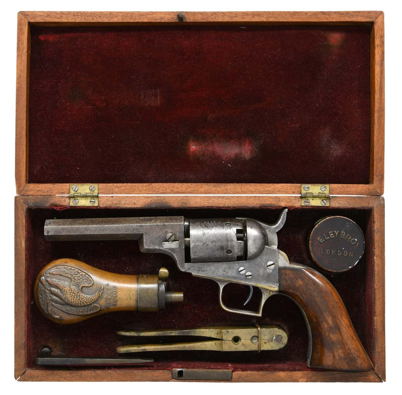 REVOLVER. Cal. 31. S# 2894. Standard configuration, 4" octagonal barrel, correct "2-line New York City address with brackets", no provision for loading assembly, left side of frame has small "COLTS PATENT", silver plated square back brass trigger guard & backstrap, varnished walnut grip, 5-shot cylinder with rolled "Indian fight scene". This is Colt's first pocket sized revolver after the Paterson models. Housed in fine original early "Paterson style" bevel casing fitted with "COLTS PATENT" eagle flask, 2 cavity brass mold, Ely cap tin, and screwdriver/nipple wrench combination tool. These revolvers typically saw hard use and early examples like this one made in 1848 rarely have original Colt casings and strong original finish. This is a beautiful example with an excellent collection history. CONDITION: very good-fine overall, appears all original & matching throughout other than one replaced screw in grip frame. Metal has sharp crisp edges, crisp markings, strong traces of blue on barrel, traces of case color on hammer & frame, fire blue on trigger, about 25% original varnish, grip frame retains about 80% original silver plate. Walnut casing is equally very good with soiled and stained burgundy velvet lining, accessories good. Mechanically fine well-defined rifled bore. PROVENANCE: Bobby Smith 2000, Exemplary Colt collection of Horst Kreiner. (01-23982/JS). $8,000-12,000.