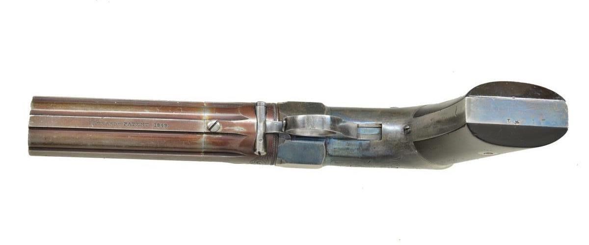 PISTOL WITH ACCESSORIES. Cal. 31. S# 60. The browned 4 1/2" bbl. set is of ribbed configuration. Tops of ribs are marked "ROBBINS & LAWRENCE CO" "WINDSOR VT" "LEONARD'S PATENT 1849". Breech area has some well cut scroll. Bbl. pivot is of early transverse screw type. "60" Is marked on bbl. face. This number also appears on frame under left grip & twice on each grip. Bbls. are retained against frame w/ spring detent at top. Blued frame as ring trigger which actuates internal rotating hammer. Frame has some lg. open scroll engraving on sides & top. Two-piece grips are of rosewood. UNATTACHED ACCESSORIES: pistol is housed in its original mahogany case lined in blue velvet which contains: an Eley cap tin, polished steel single cavity rnd. ball mold, combination ramrod & bbl. wrench, & a good quality all brass plunger type powder measure/cap container. CONDITION: very fine. Bbls. retaining about 60% original brown, silvered on sharp edges. Action retains 25-30% original blue. Stocks retain most of their original varnish. Bores are bright & shiny. Mechanically fine. Case is very fine, retaining most of its exterior varnish. Interior cloth is a bit dusty & has some compressions. Accessories are very fine. Mold still w/ bright polish. (01-21237/MGM). ANTIQUE. $2,500-3,500.