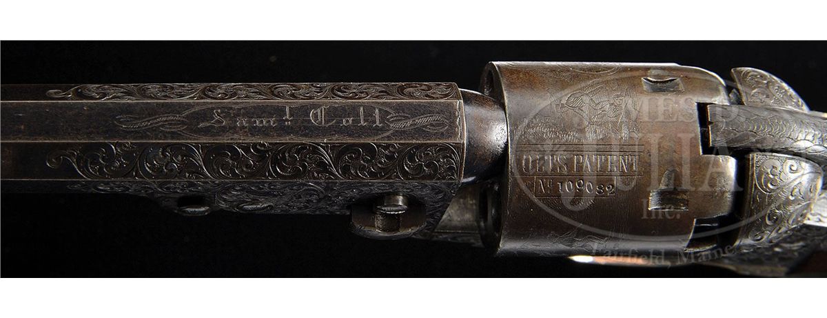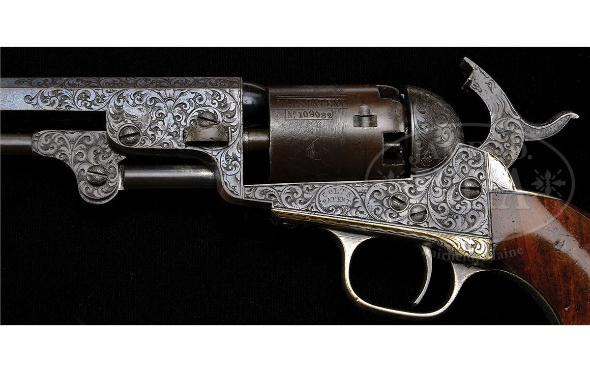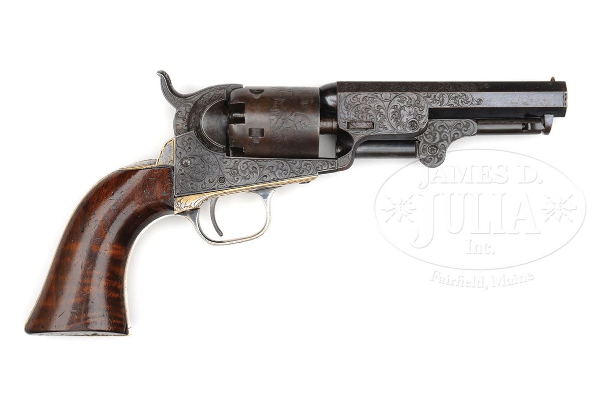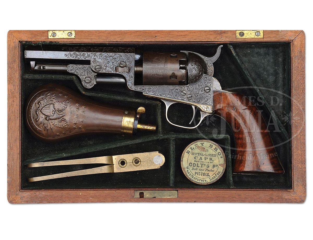 SN 109082. Cal 31. Blue and color cased hardened with 4" oct bbl, pin front sight and engraved "Saml Colt" address. Left side of the frame is engraved "COLTS PATENT" in a pillow shape. The silver plated brass trigger guard and backstrap contain a nicely figured varnished burl walnut 1-pc grip with last four digits of matching SN in the backstrap channel. Cylinder is 5 shots with stagecoach hold up scene roll marking. Revolver is beautifully engraved by master engraver Gustave Young with full coverage foliate arabesque patterns on the frame which extend over the bbl lug and top side flats with matching patterns on the rammer pivot. One scroll on the left side of the bbl lug terminates in Mr. Young's stylized dog's head and others terminate in flower blossoms. Matching pattern engraving is also on the backstrap, buttstrap and trigger guard. Hammer is deluxe engraved with foliate arabesque patterns on the shank, a wolf's head on each side of the hammer nose, fish scale patterns on the sides of the spur and top edge with a hand checkered spur. SN's on the bottom of the revolver and buttstrap are accompanied by a small punch mark which signifies to the polishing room to do extra polishing for engraving. Accompanied by an orig green velvet lined mahogany casing compartmented in the bottom for a double sided eagle and stars pocket sized flask, a brass 2 cavity "COLTS PATENT" mold without sprue cutter and a small cap tin with applied Eley Bros label. CONDITION: Extremely fine, all matching including wedge and grip. Bbl retains 93-95% strong blue with some thinning over the top flats and sharp edges. Rammer and handle retain dark case colors. Frame and hammer also retain dark case colors. Cylinder is a medium brown patina and shows 96-98% stagecoach hold up scene roll marking. Trigger guard and backstrap retain virtually all of their orig silver plating. Buttstrap and bottom edges of the grip are moderately battered. Grip has good edges with light wear and a few nicks and scratches and retains most of its orig varnish. Mechanics are fine, bright shiny bore with a few scattered spots of light rust. Case has 3 or 4 grain checks in the bottom otherwise is sound with usual handling & storage nicks & scratches and overall retains most of its orig varnish. Interior is lightly faded inside the lid, moderately to heavy faded with heavy soil in the bottom. Partitions are solid. Flask is extremely fine retaining 97-98% orig finish. Mold has nicks, scratches & dings with bright cavities. 4-49604 JR51