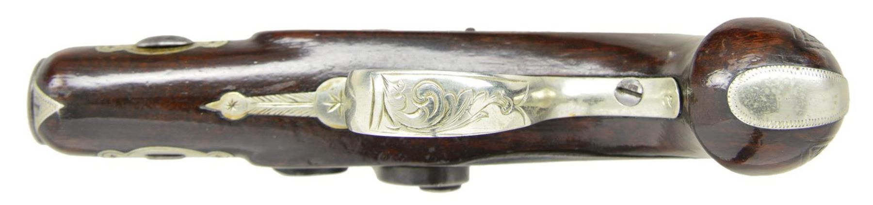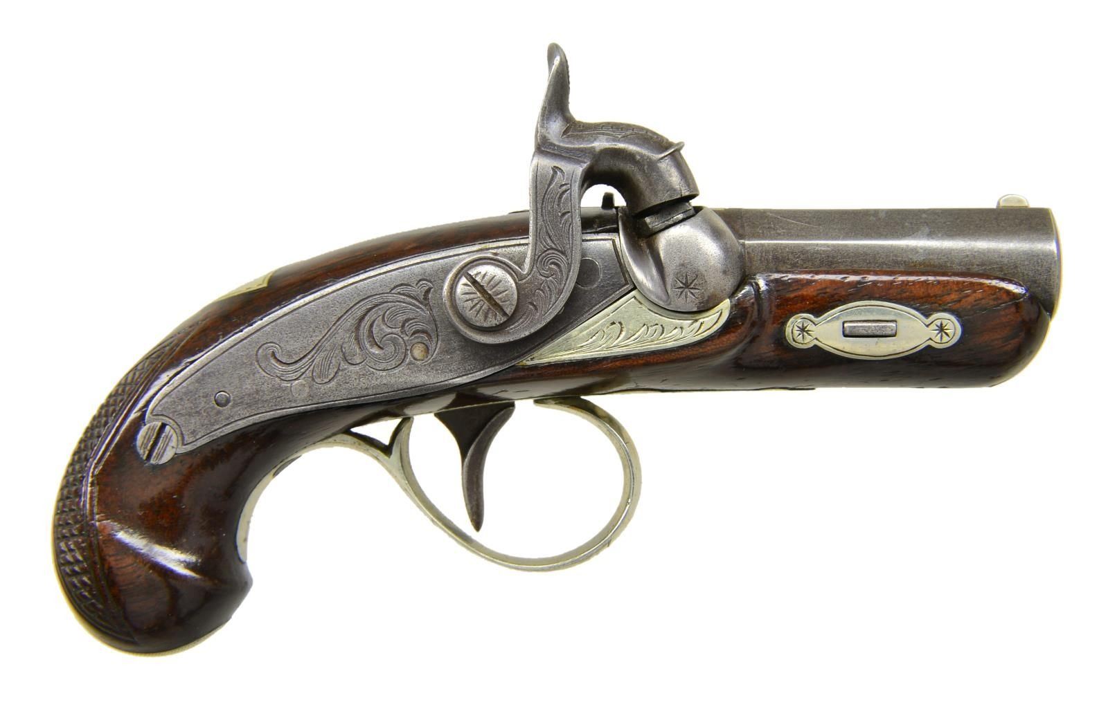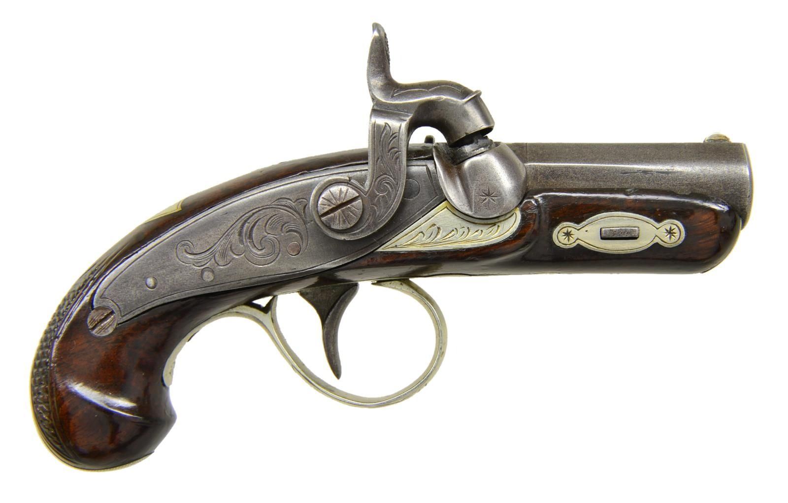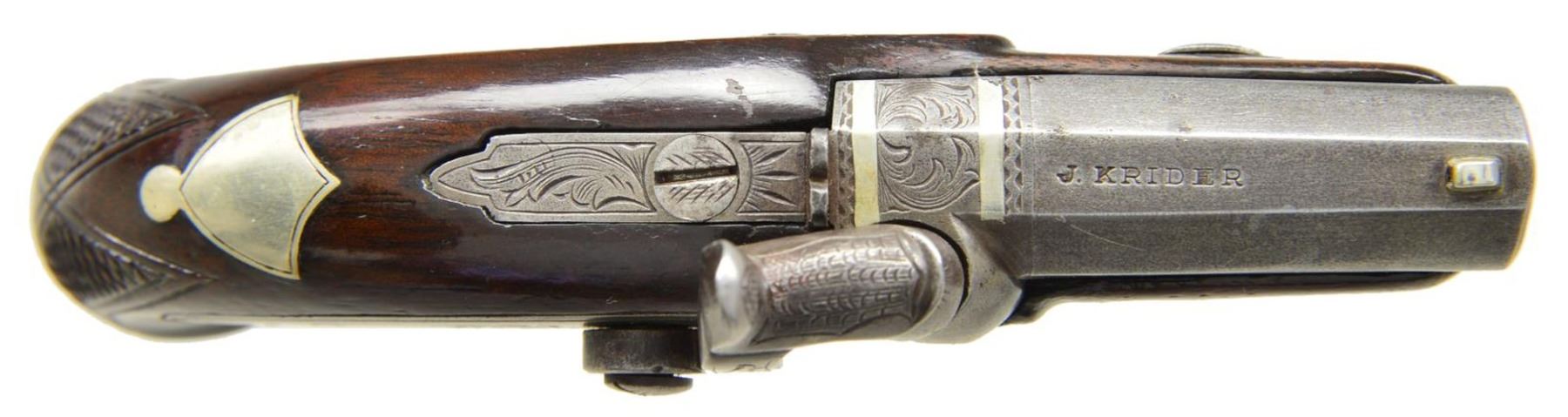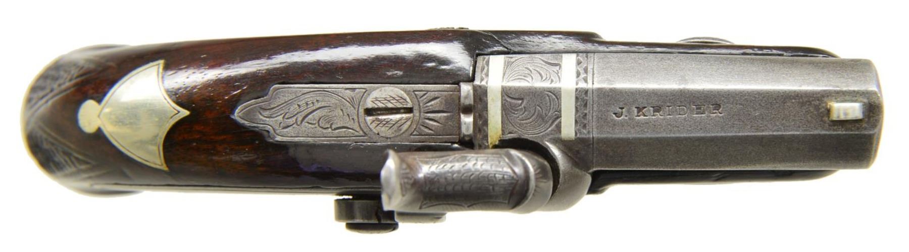 TYPE PERCUSSION POCKET PISTOLS WITH ACCESSORIES. Cal. 41. NSN. The famous firm of John Krider of Philadelphia, PA made pocket percussion pistols which were very similar to the popular guns by Henry Deringer. This pair have 2" rifled barrels. Breech sections are separate and are inlaid with 2 German silver bands. Tops of barrels are marked "J. KRIDER". Small size back spring percussion locks are fitted with flat faced hammers. Walnut stocks with small checkered bag grips are German silver mounted. Locks and mounts have some scroll engraving. Shield shaped crest plates at tops of grips are unmarked. UNATTACHED ACCESSORIES: pistols are housed in a black Morocco leather covered case with dual hook closure. Interior of lid is lined in scarlet velvet and has small John Krider paper label attached. Bottom compartment is lined in red suede and is French fitted for pistols & accessories. Accessories include unmarked 3 1/2" powder flask with fluted copper body, ebony handled nipple wrench, ebony handled turn screw, nutcracker type bullet mould marked "90", & a brass loading rod. Two covered compartments have mahogany covers with bone handles & hold lead balls & past owners notes, stating that these pistols were once owned by Turner Kirkland. CONDITION: very good to fine, iron and steel with old cleaning to gray brown. Stocks with varnish refinish. German silver cleaned and remains fairly bright. Case leather fine with some marks. Interior cloth of top and label are good with some impressions. Bottom compartment is also fine, accessories are good. Condition matching pistols. (01-21850/MGM). ANTIQUE. $7,000-10,000.