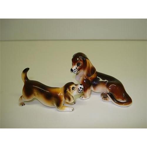 VICTORIAN HOUSE ANTIQUES PRESENTS: LOVELY 2 CUTE DOG FIGURINES, DEPICTING MOTHER AND PLAYFUL YOUNG PUP, EXCELLENT DETAIL, QUALITY BONE CHINA, NOT MARKED BUT I AM 99 % SURE ENGLISH MADE., MOTHER STANDS 1 3/4 high x 3 1/4 long and pup stands 1 1/4 high and 2 1/2 inch long,Excellent,condition, no chips or cracks - US BUYER TO PAY 7.00 FOR SHIPPING PLUS INSURANCE.THANKS.