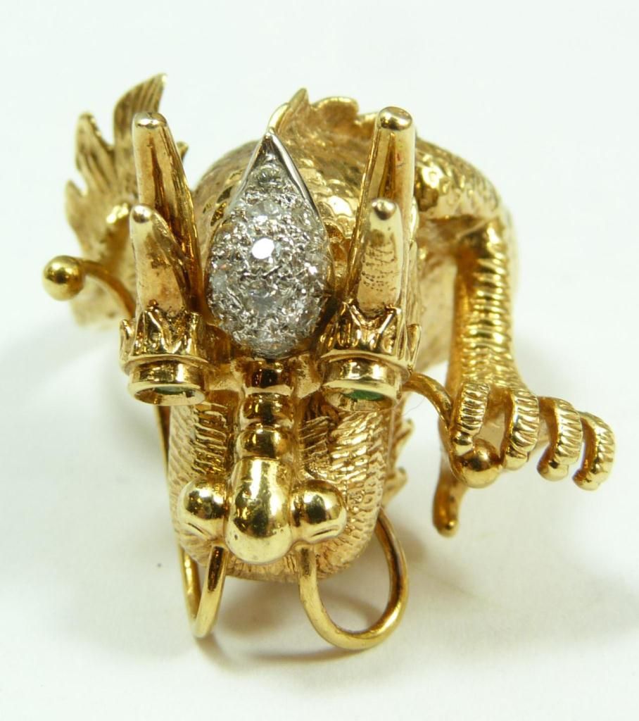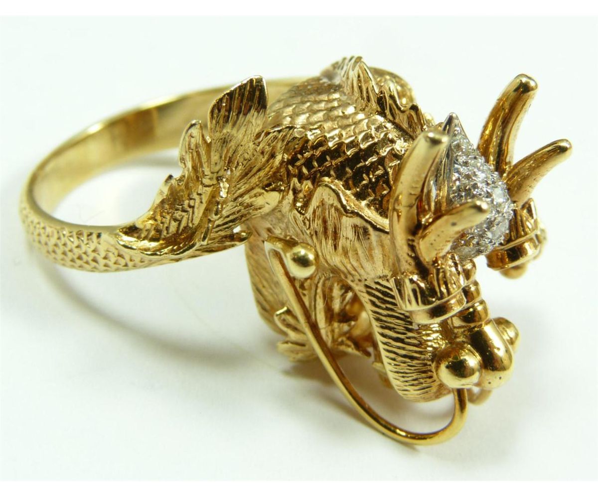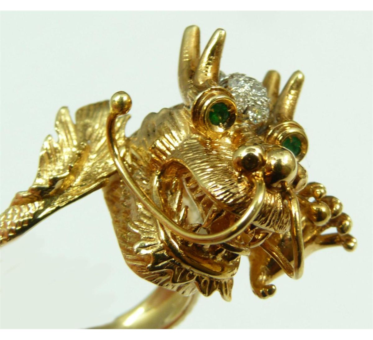 A stunning 18K yellow gold figural dragon head ring having a diamond cluster to forehead. Holds round cut emeralds to eyes. Textured scale and tail design to band. Ring size 9. Total weight of 12dwt.
