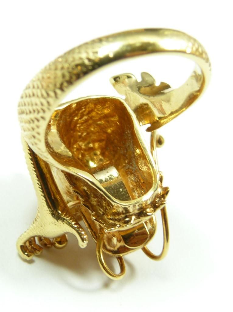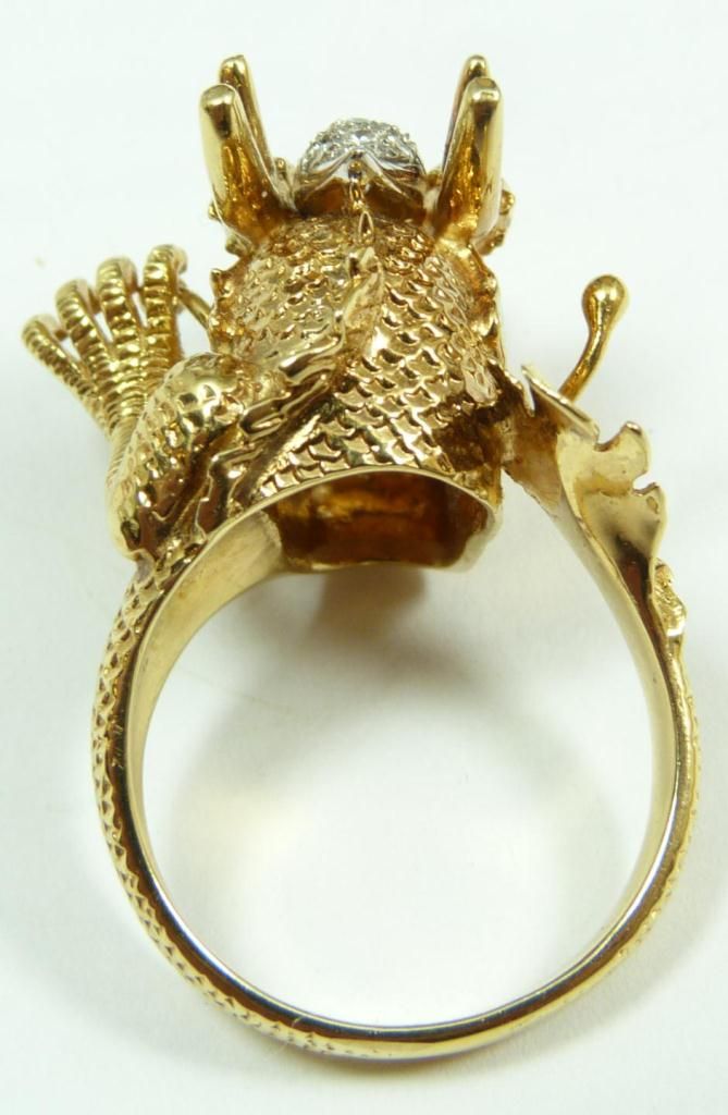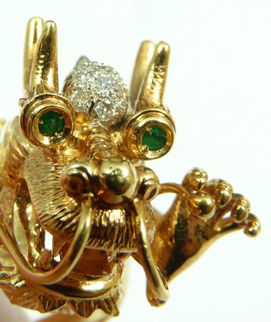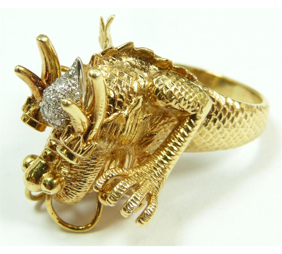 A stunning 18K yellow gold figural dragon head ring having a diamond cluster to forehead. Holds round cut emeralds to eyes. Textured scale and tail design to band. Ring size 9. Total weight of 12dwt.